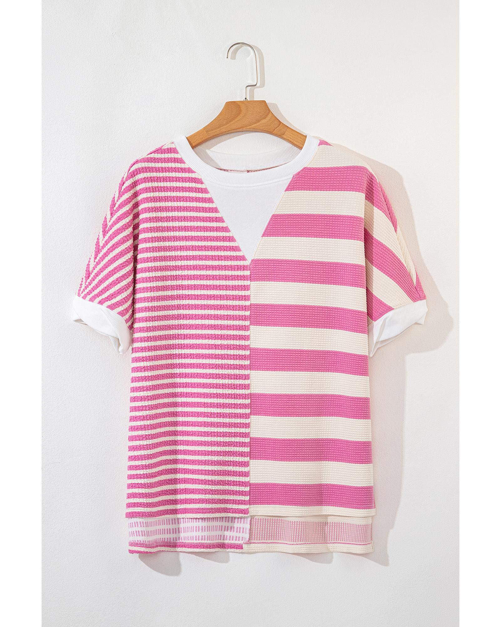 Pink Stripe Patchwork Textured Short Sleeve High Low Loose Top – S