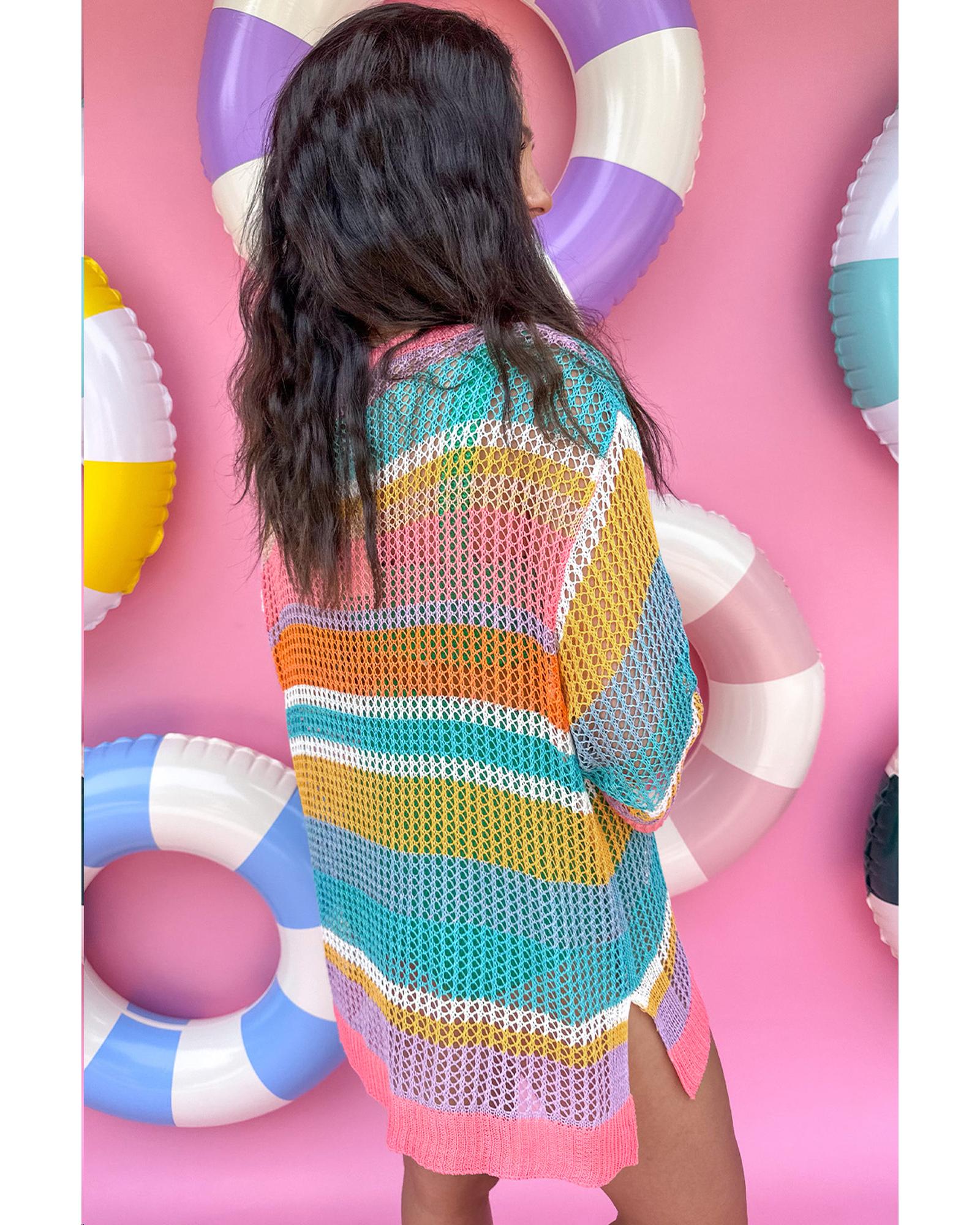 Pink Stripe Plus Size Open Knit Patch Pocket Short Sleeve Sweater – 3X
