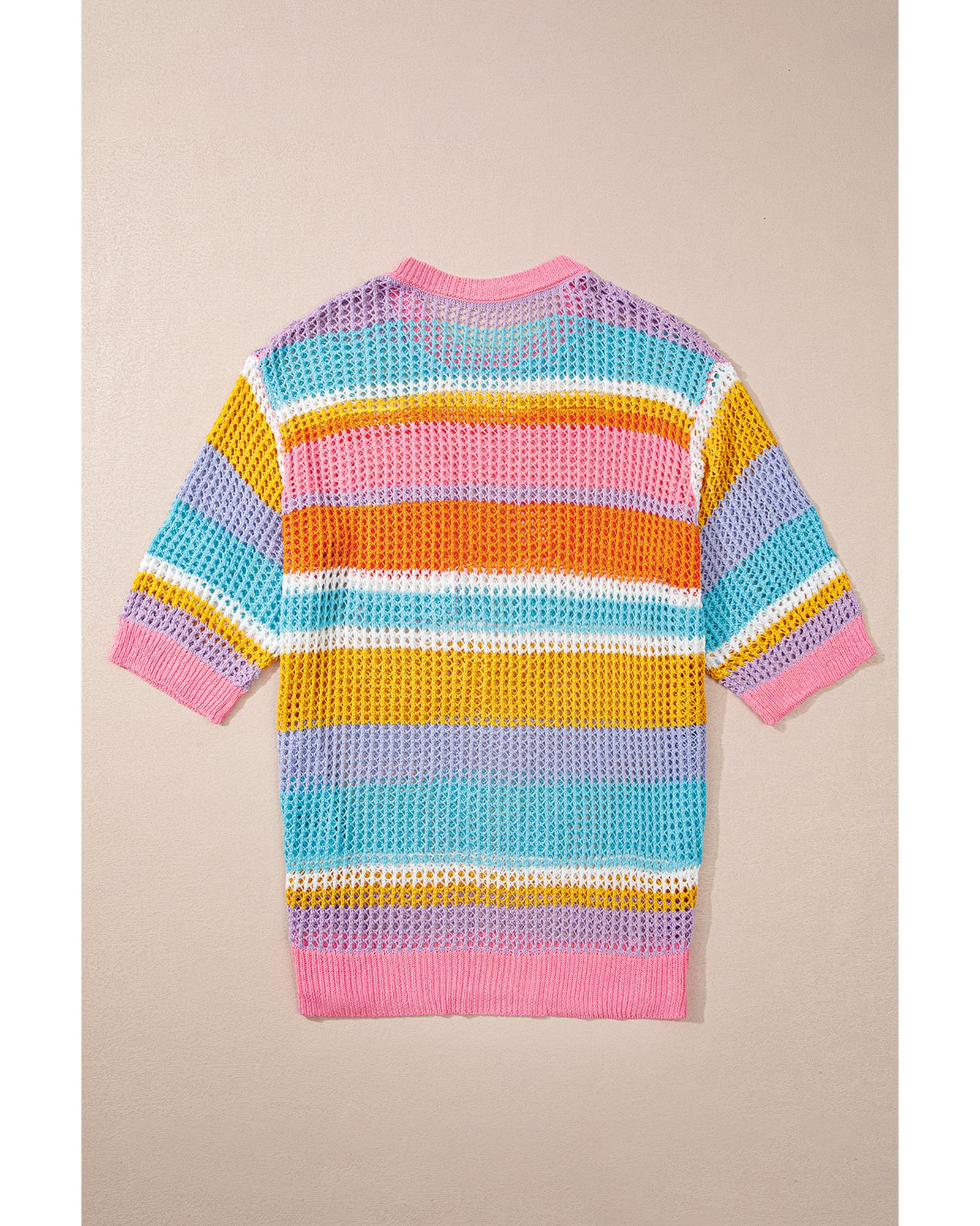 Pink Stripe Plus Size Open Knit Patch Pocket Short Sleeve Sweater – 4X