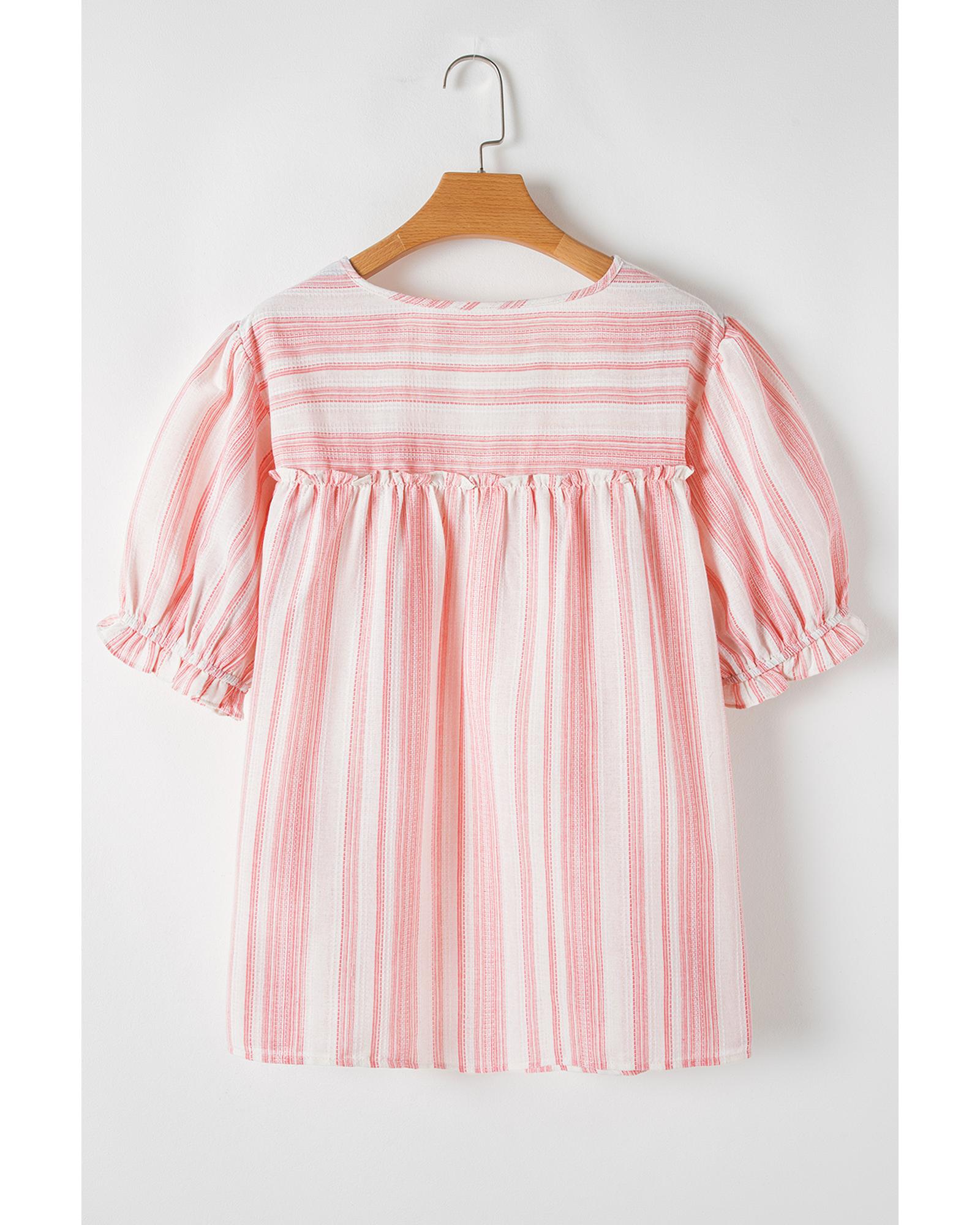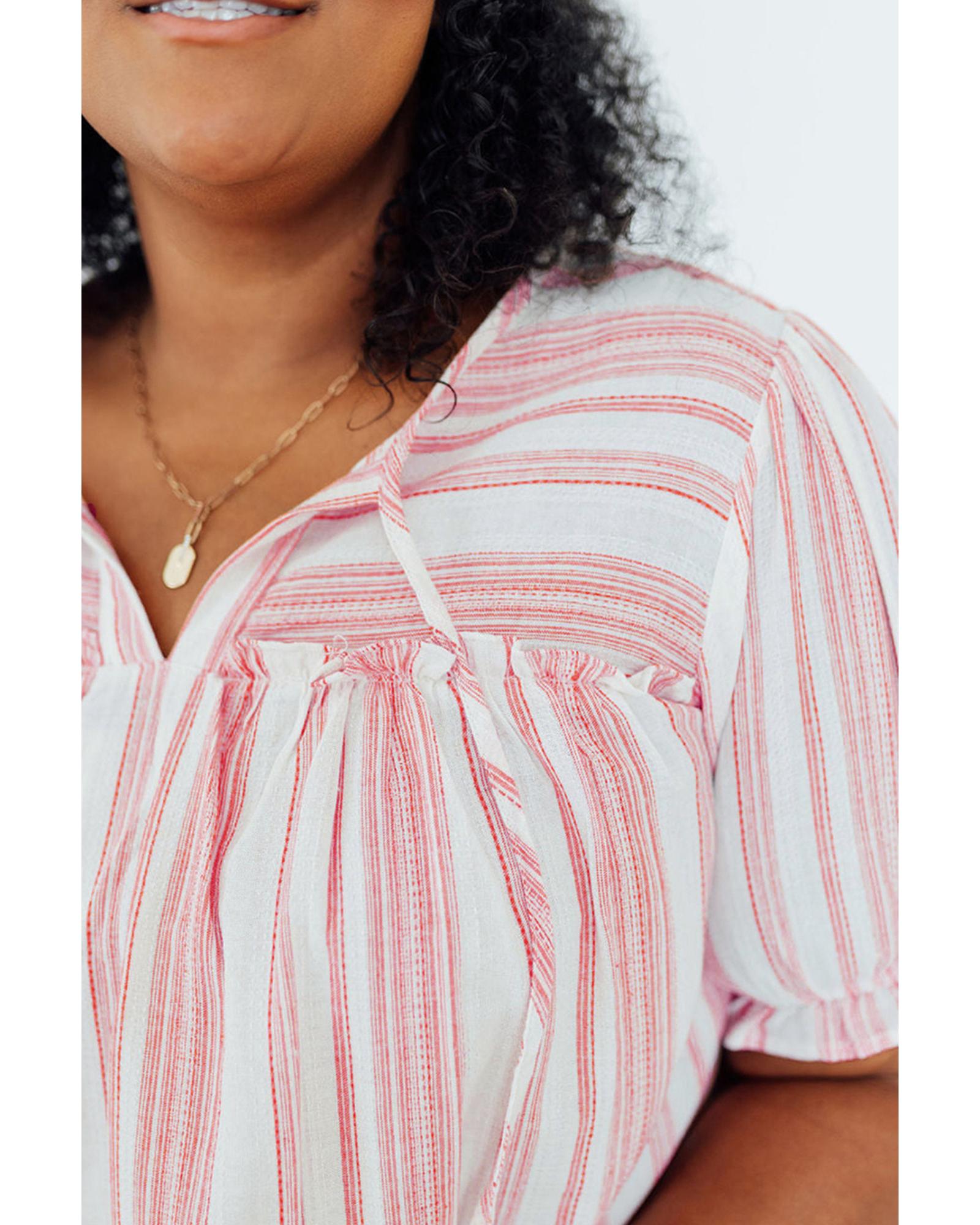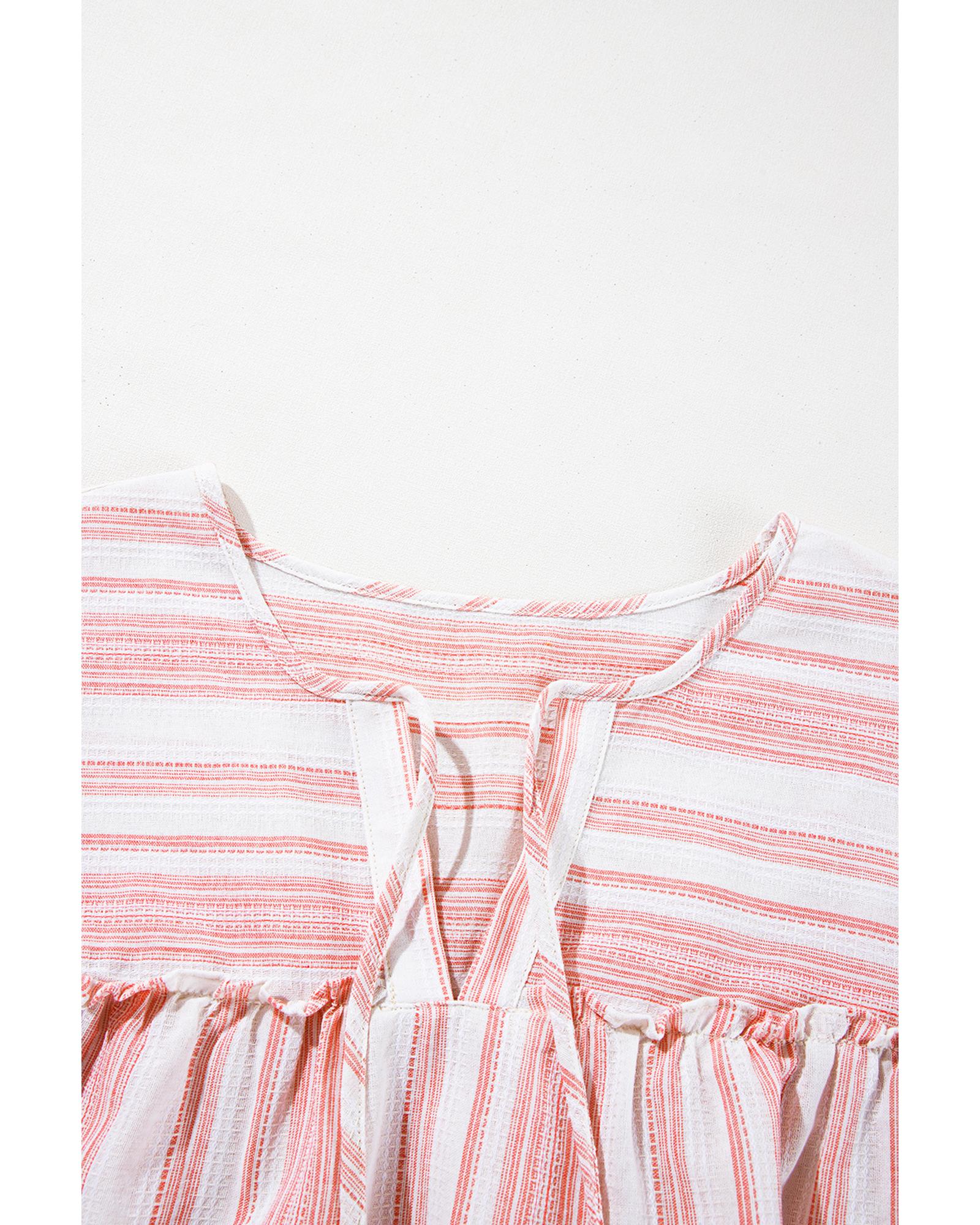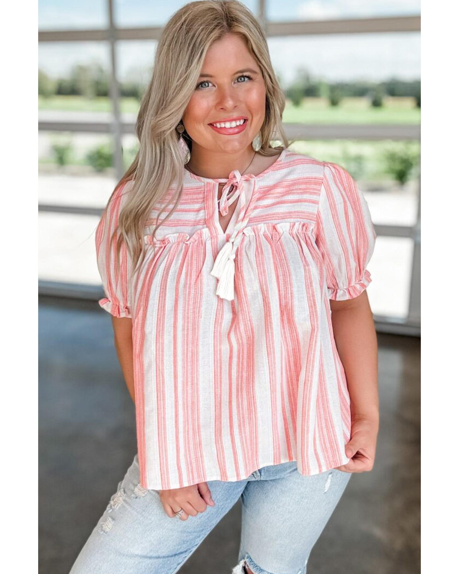 Pink Stripe Plus Size Tassel Tie Frilled Detail Short Sleeve Blouse – 4X