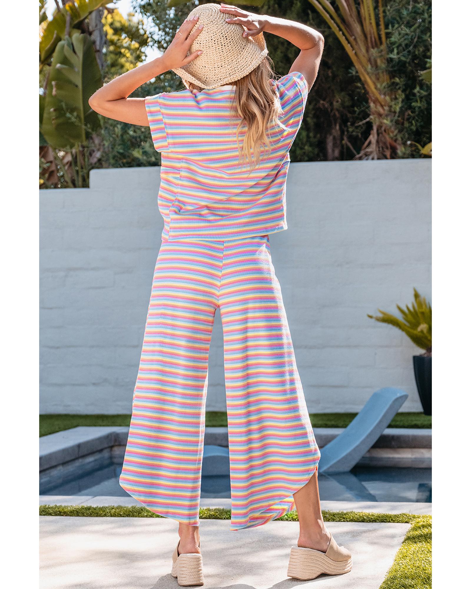 Pink Stripe Rainbow Tee Tasseled String Wide Leg Pants Set - S