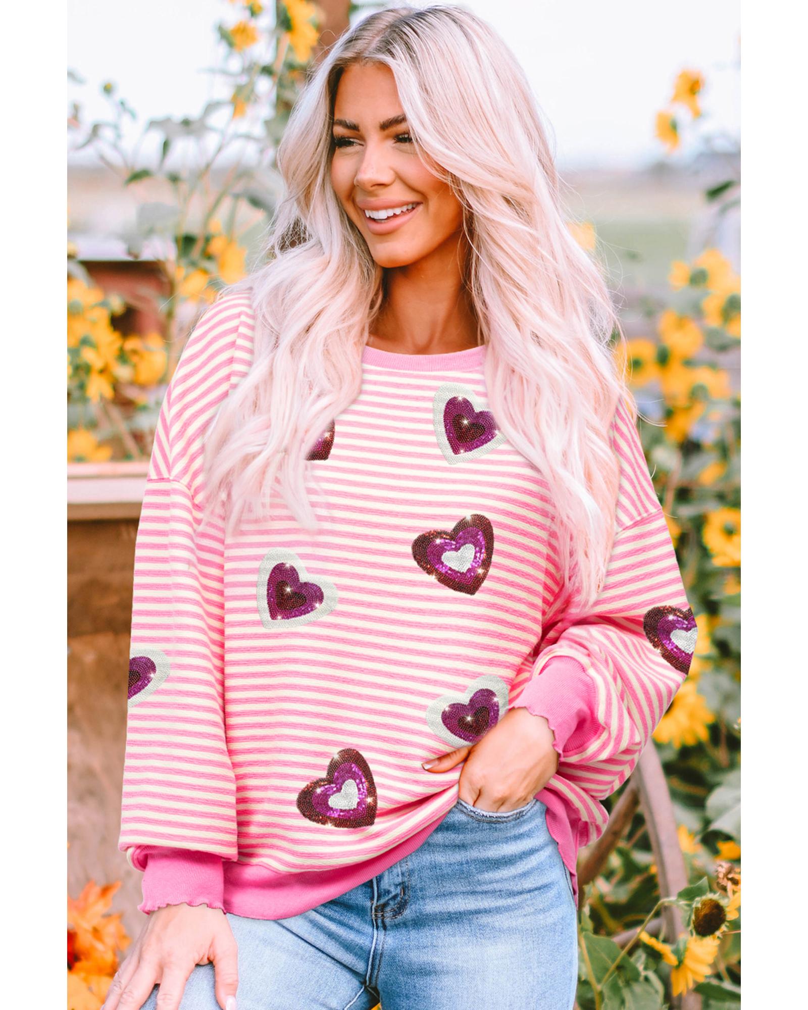 - Pink Stripe Sequin Heart Patched Pattern Long Sleeve Valentines Top