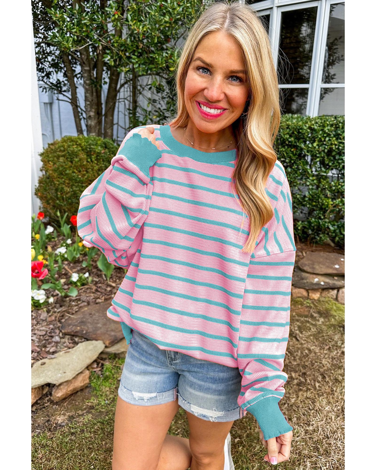 Pink Stripe Trimmed Round Neck Drop Shoulder Loose Sweater – M