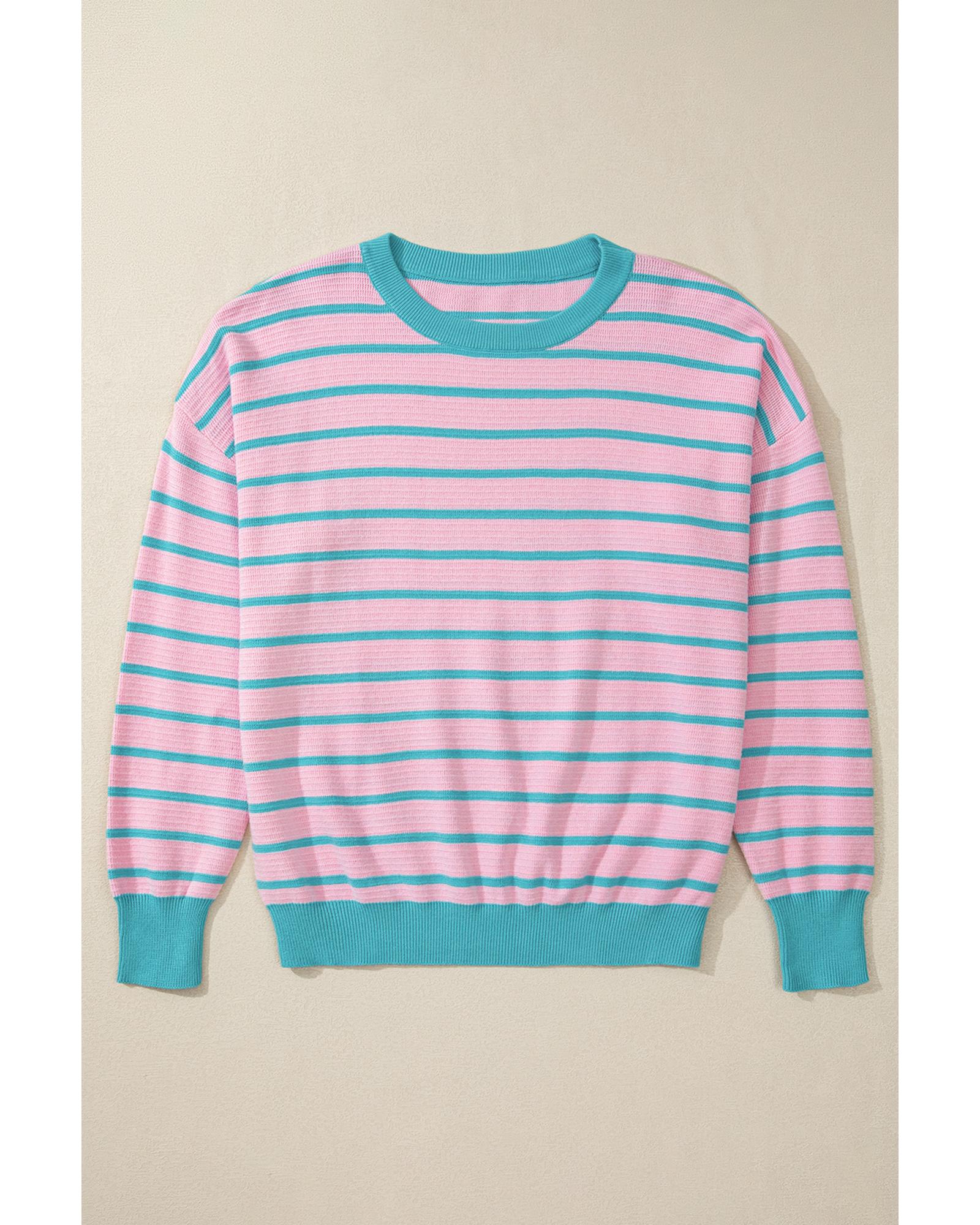 Pink Stripe Trimmed Round Neck Drop Shoulder Loose Sweater – XL