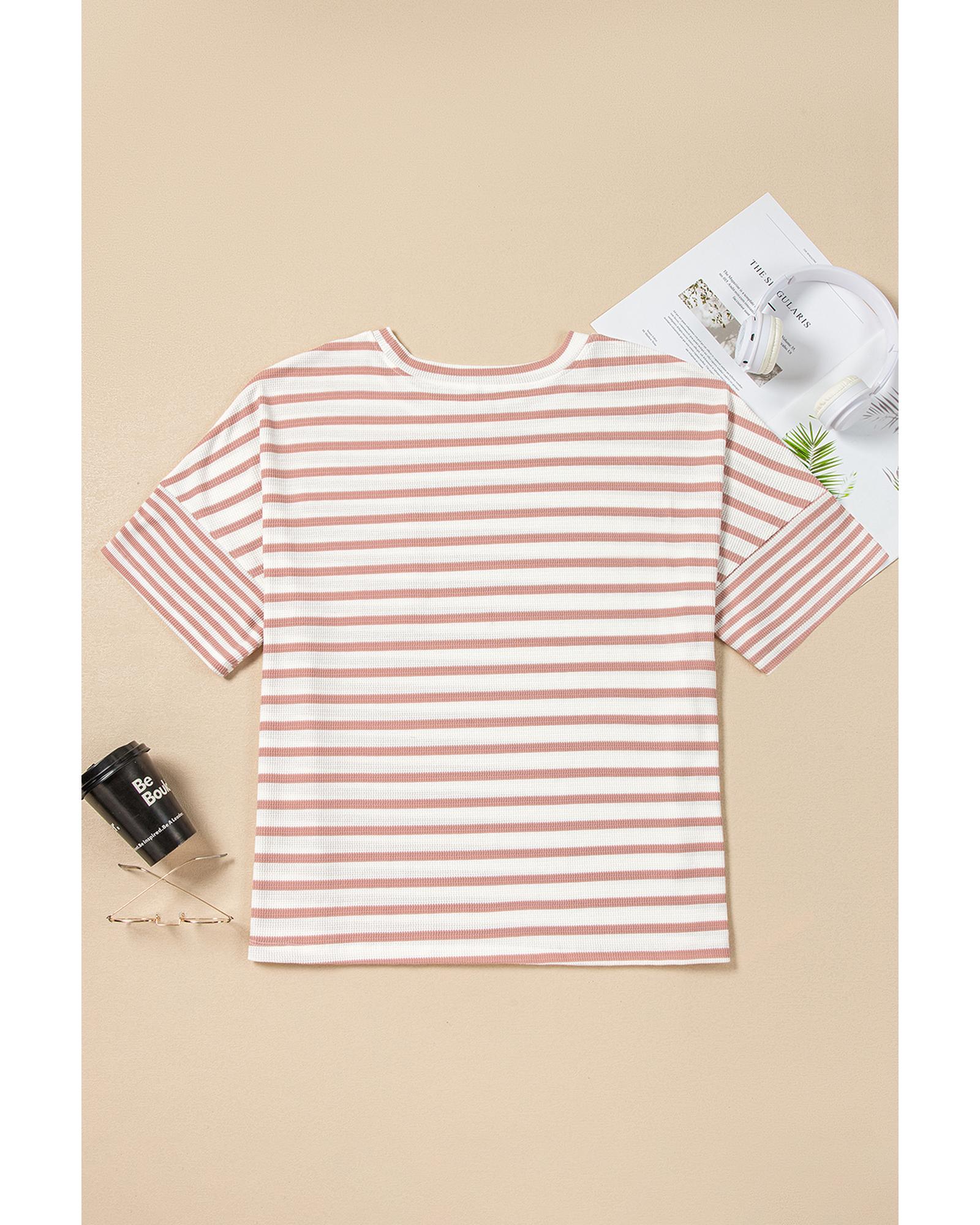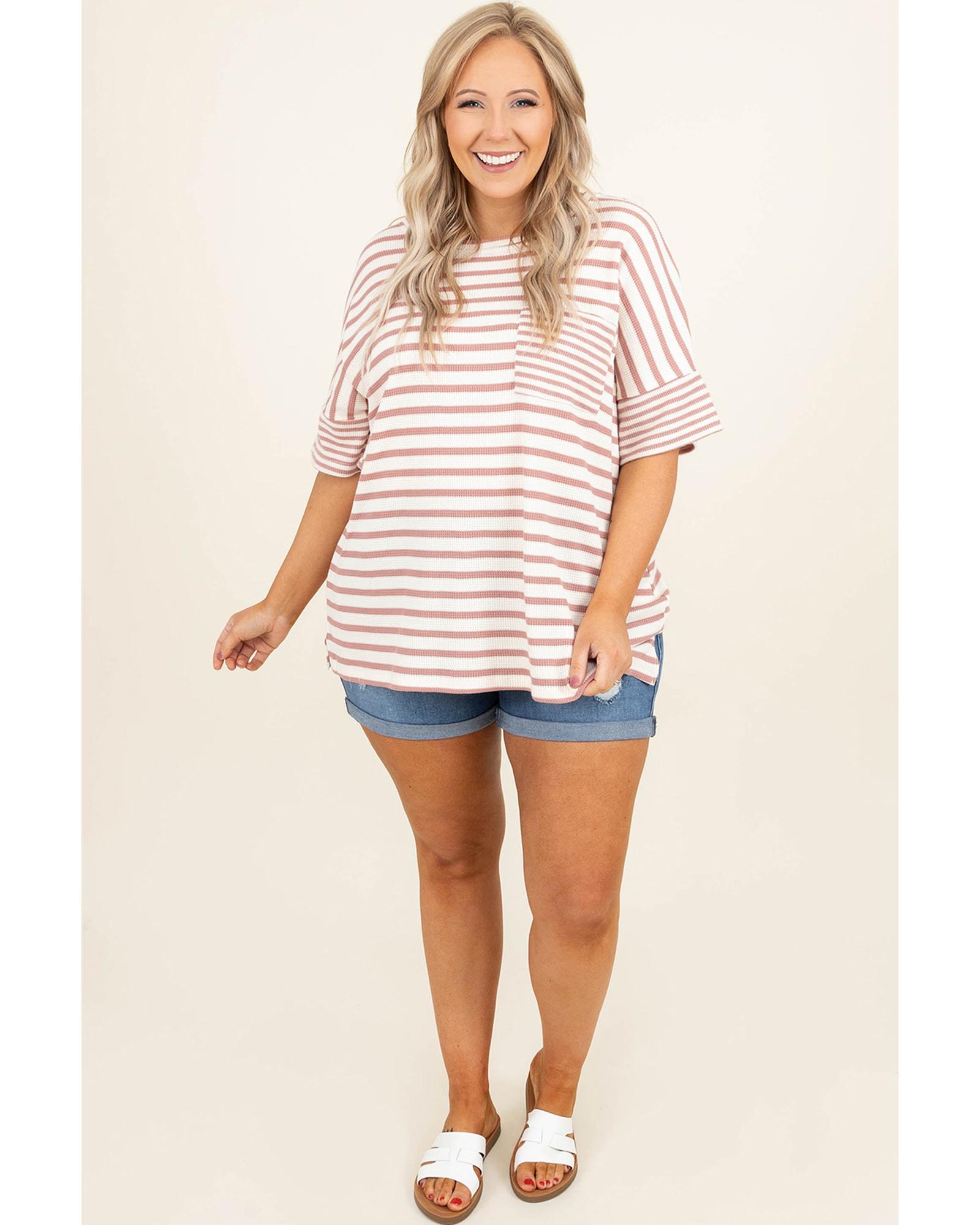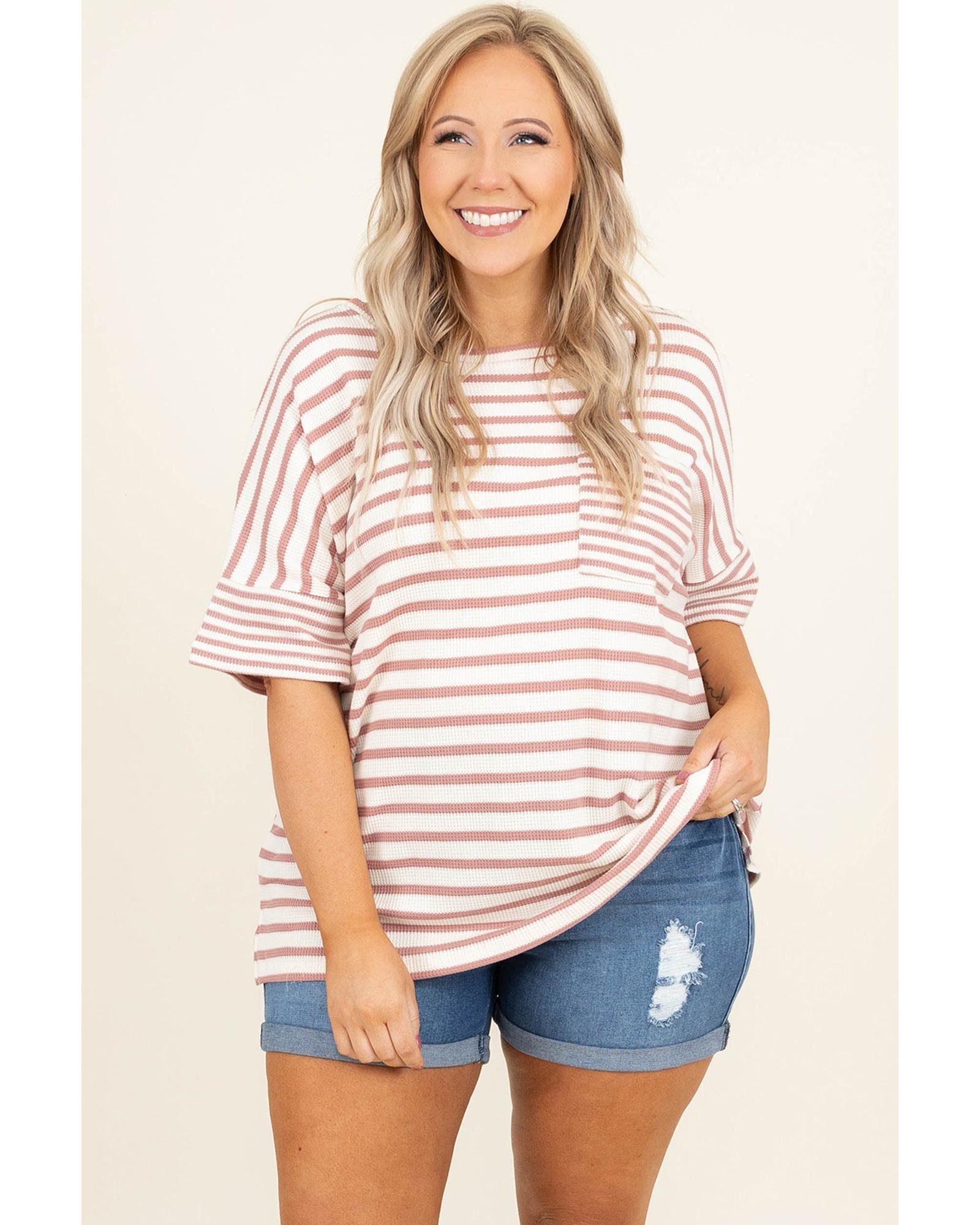 Pink Stripe Waffle Knit Pocketed Half Sleeve Plus Size T Shirt – 1X