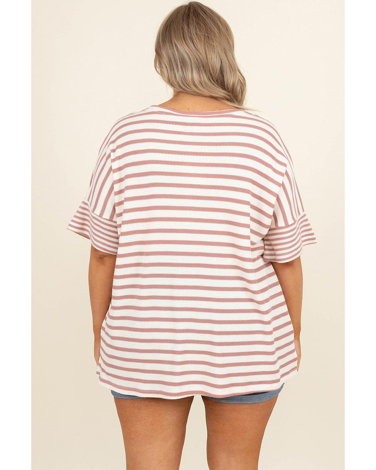 Pink Stripe Waffle Knit Pocketed Half Sleeve Plus Size T Shirt - 4X