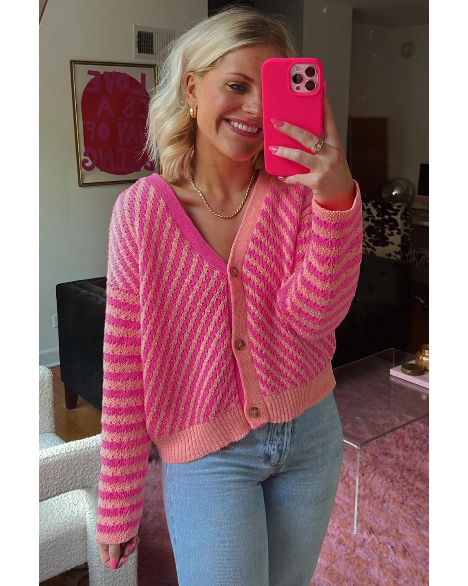 Pink Striped Buttoned V Neck Drop Shoulder Cardigan – M