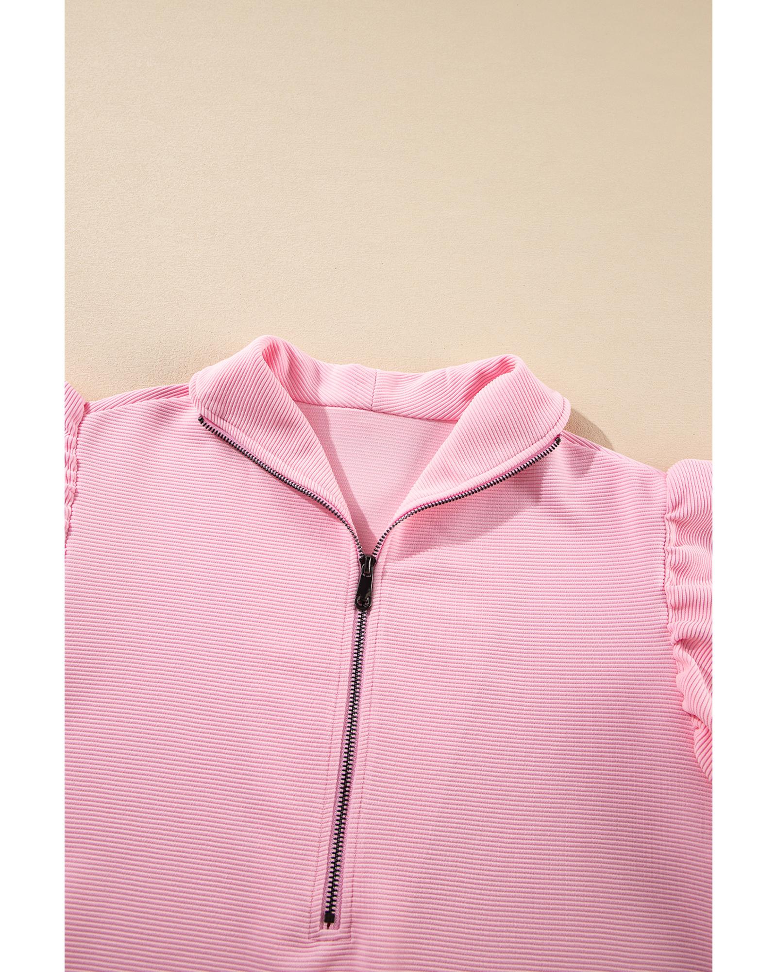 Pink Textured Ruffled Sleeve Zipped Top and Wide Leg Pants Set - S