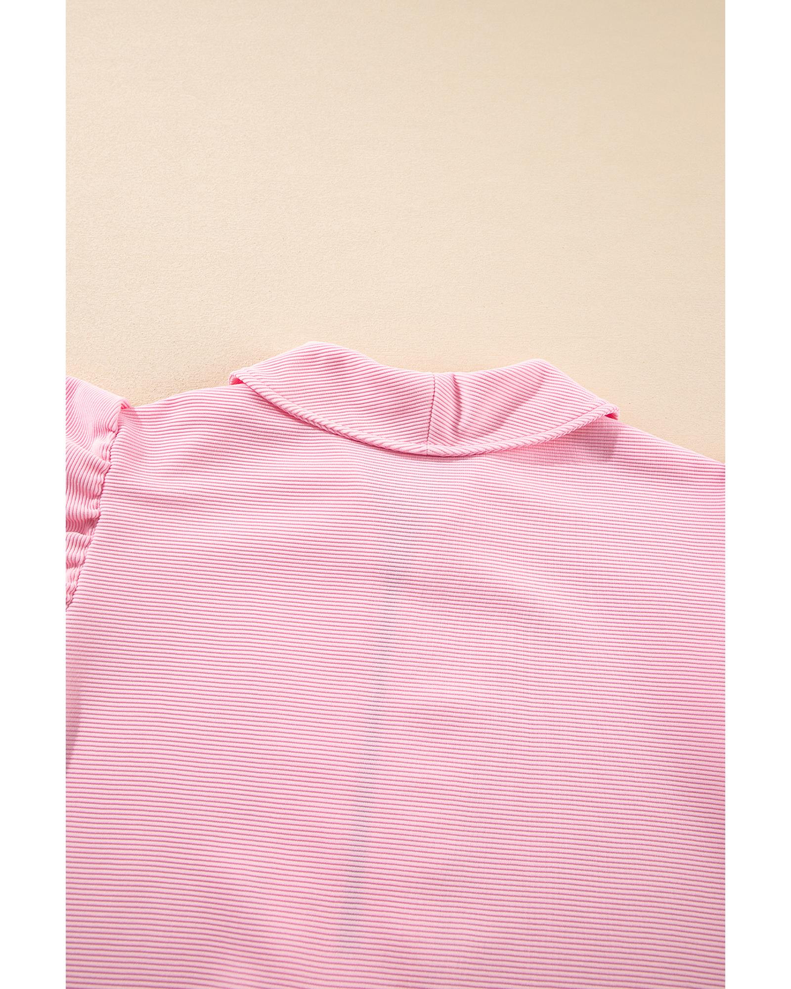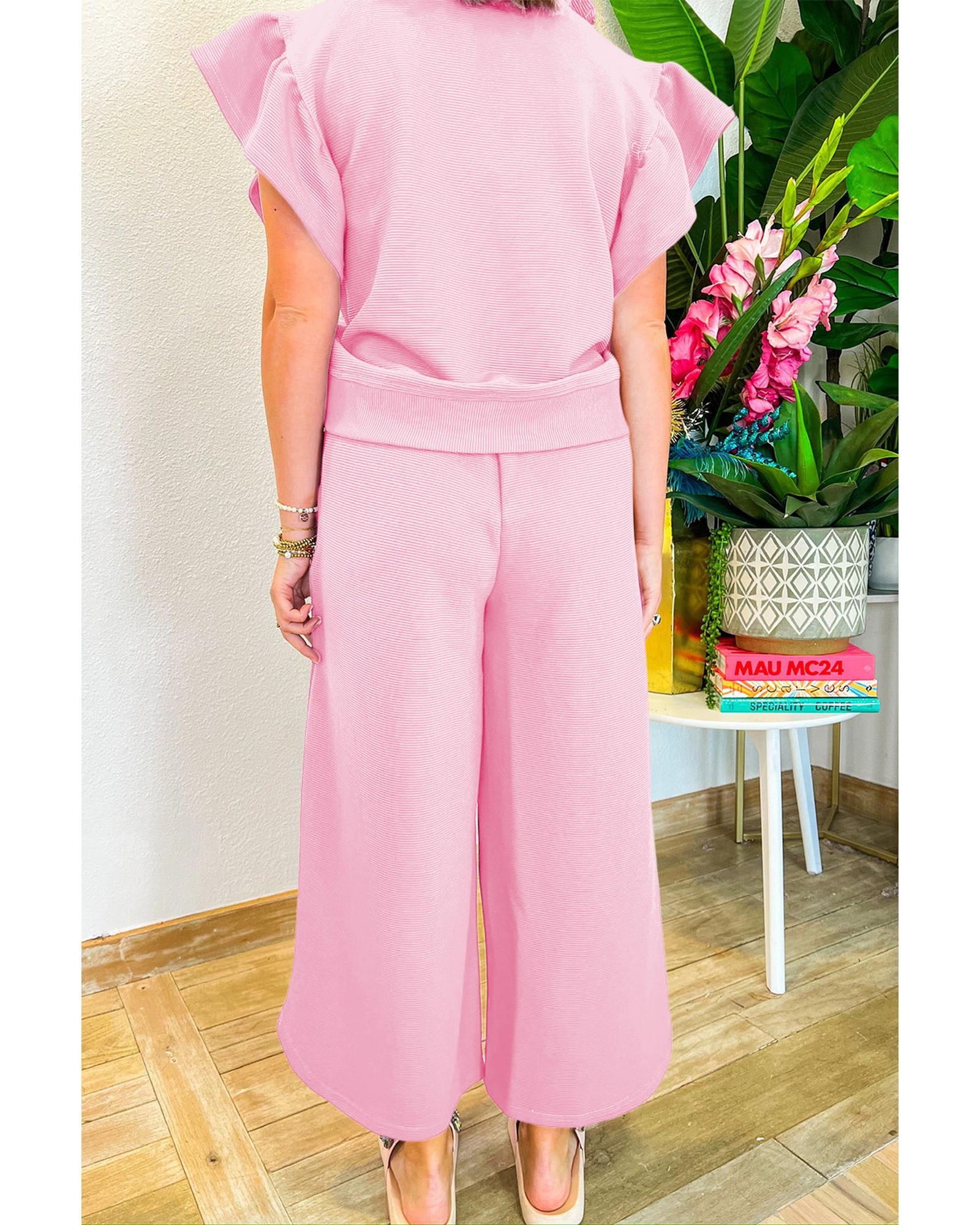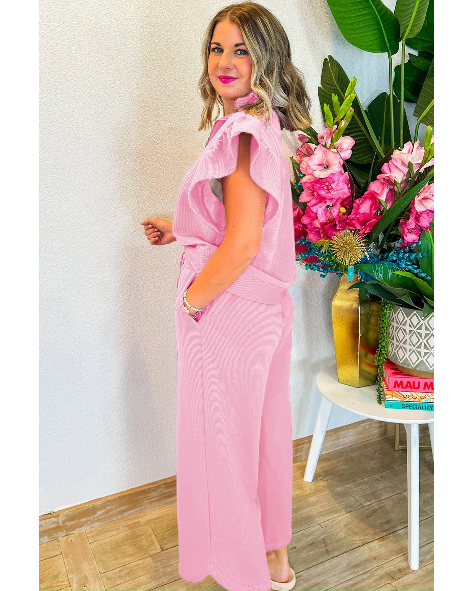 Pink Textured Ruffled Sleeve Zipped Top and Wide Leg Pants Set – XL