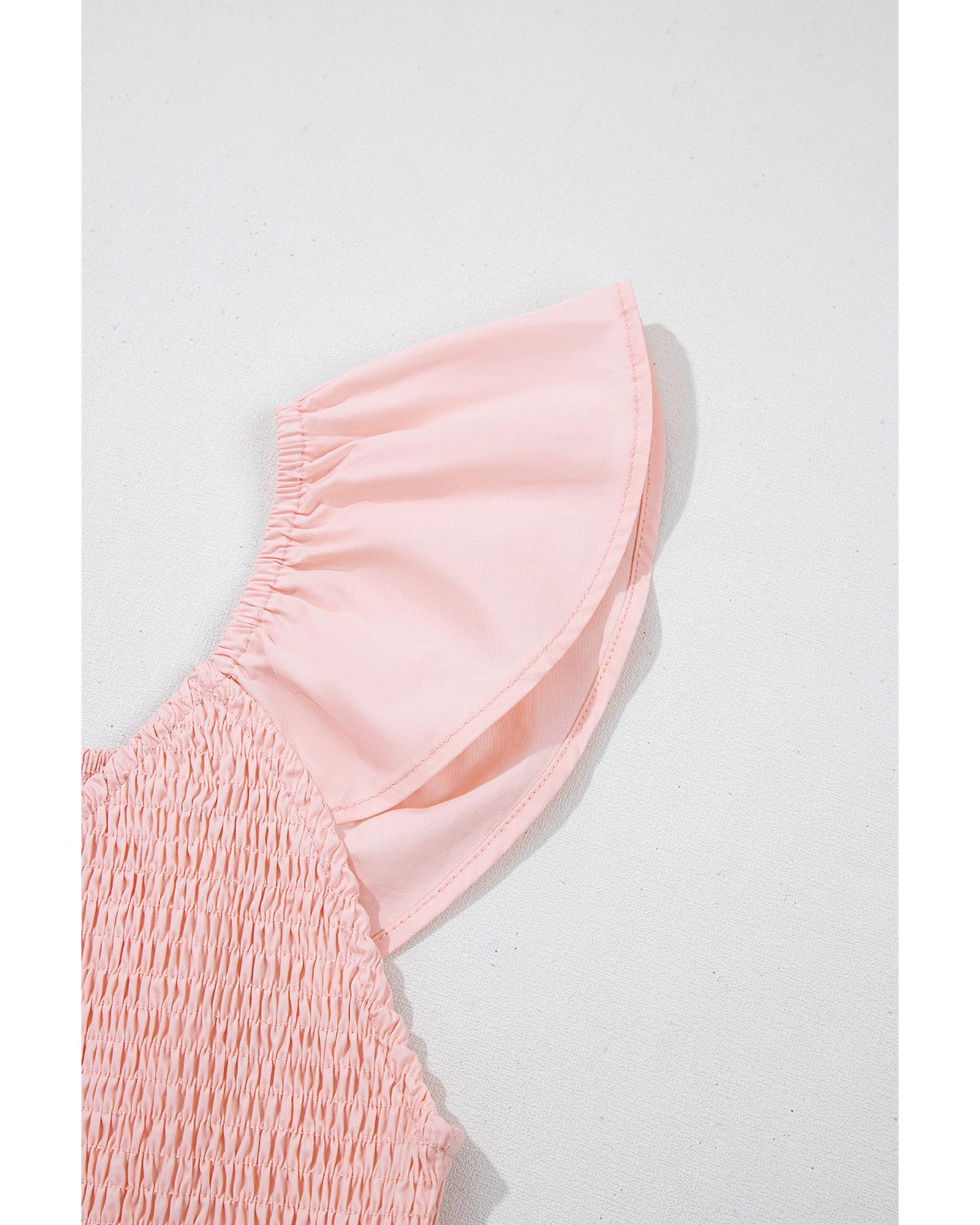 Pink V Neck Flutter Sleeve Smocked Bodice High Waist Ruffle Maxi Dress – M