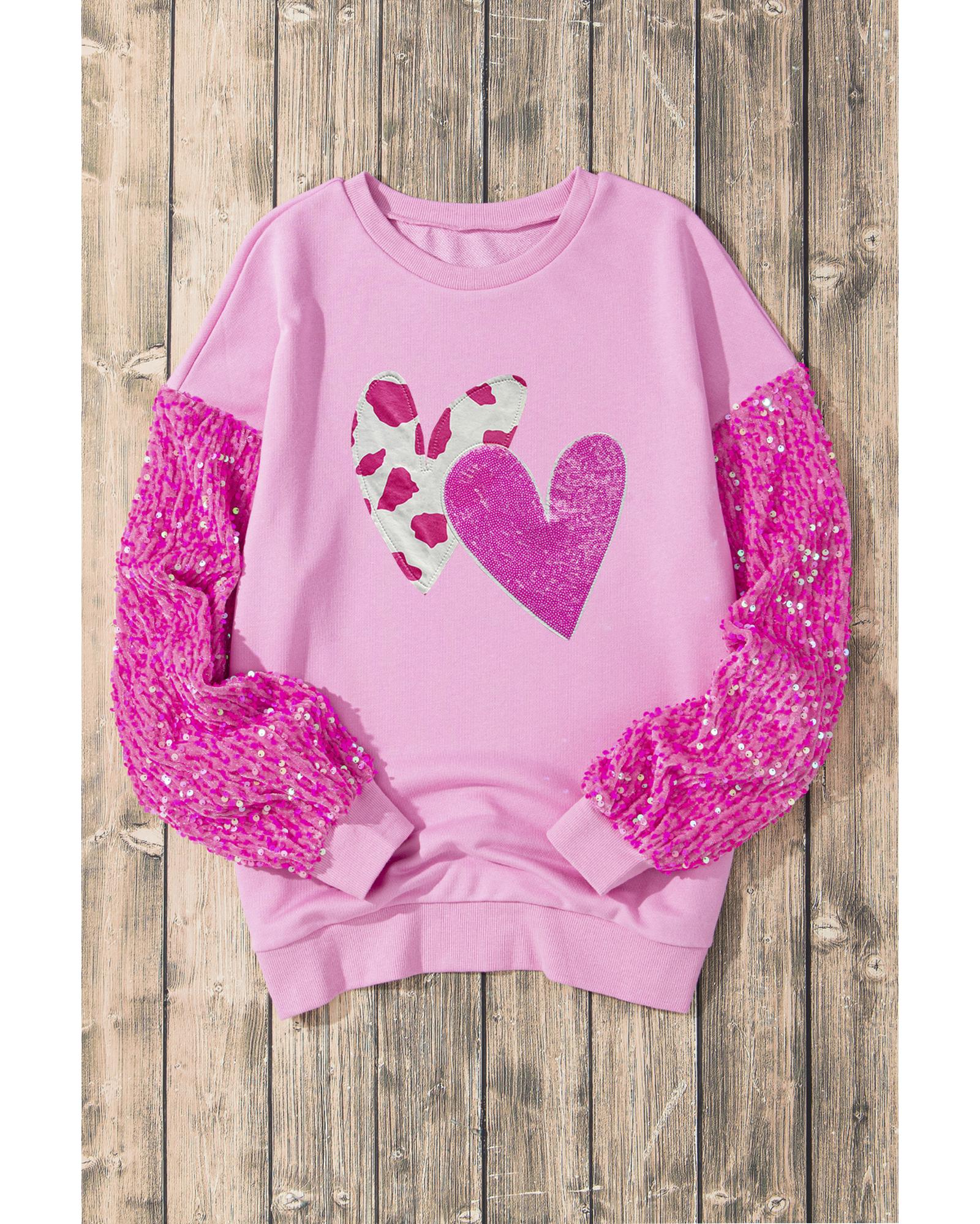 Pink Valentines Heart Graphic Sequin Patchwork Long Sleeve Top – L