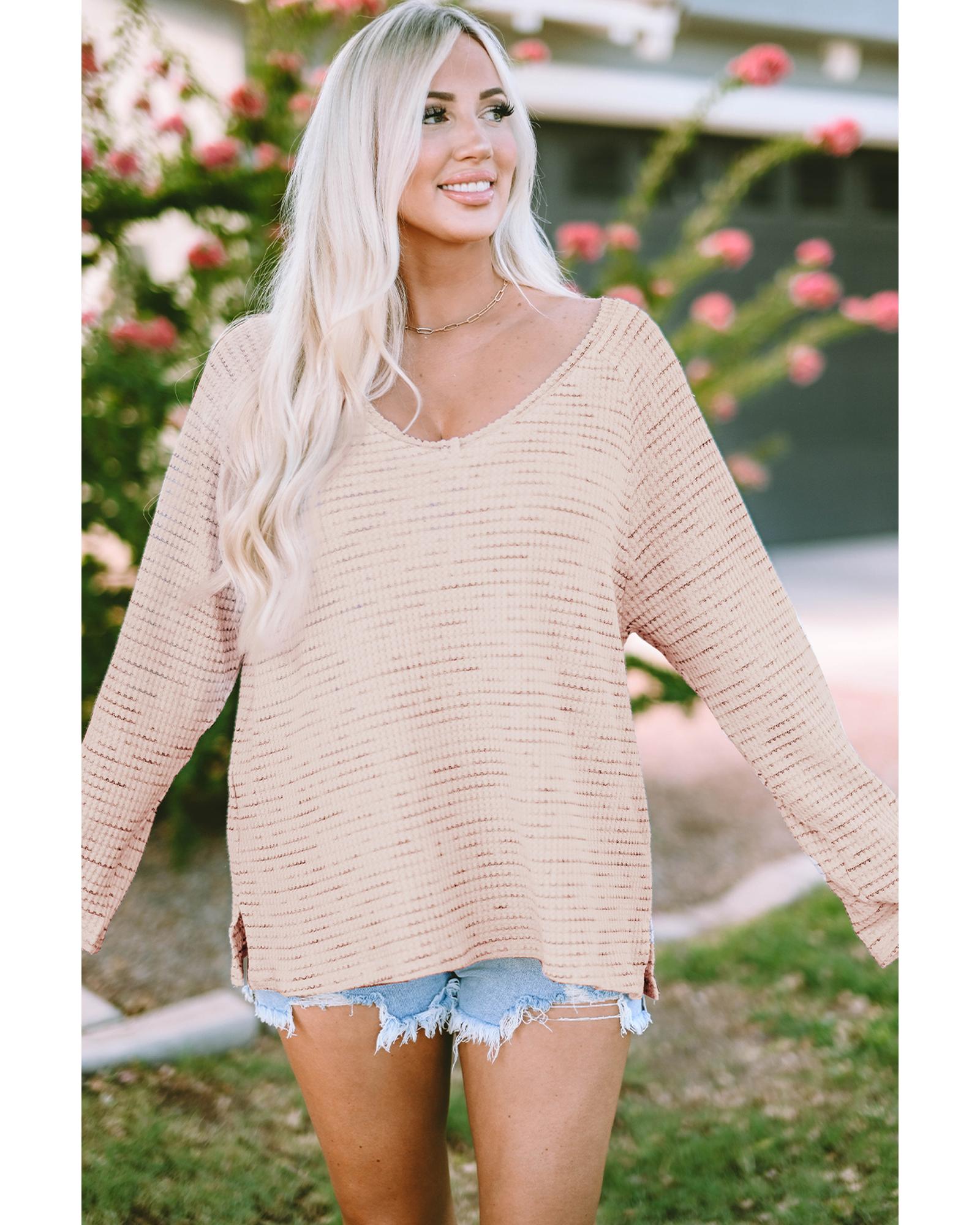 Pink waffled knit long sleeve top V - neck and loose cut for a comfortable fit Solid color design with frayed details Versatile piece for both casual and formal occasions Pairs well with ripped jeans or a skirt