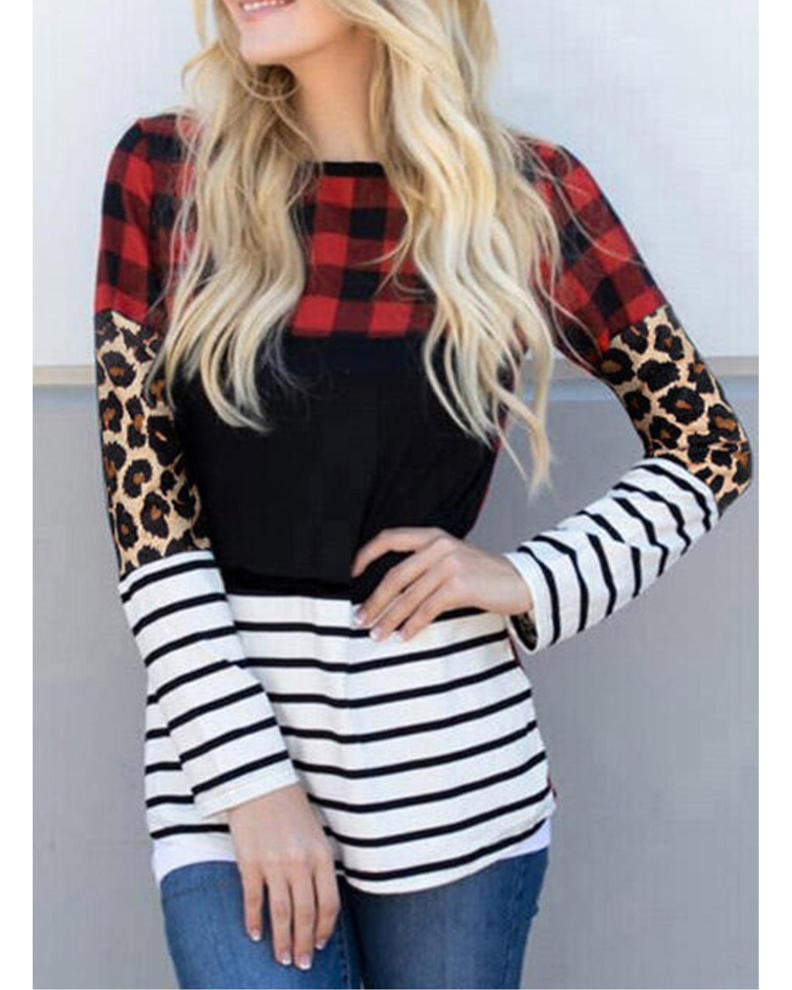 Plaid Print Leopard Splicing Striped Color Block Long Sleeve Top – M