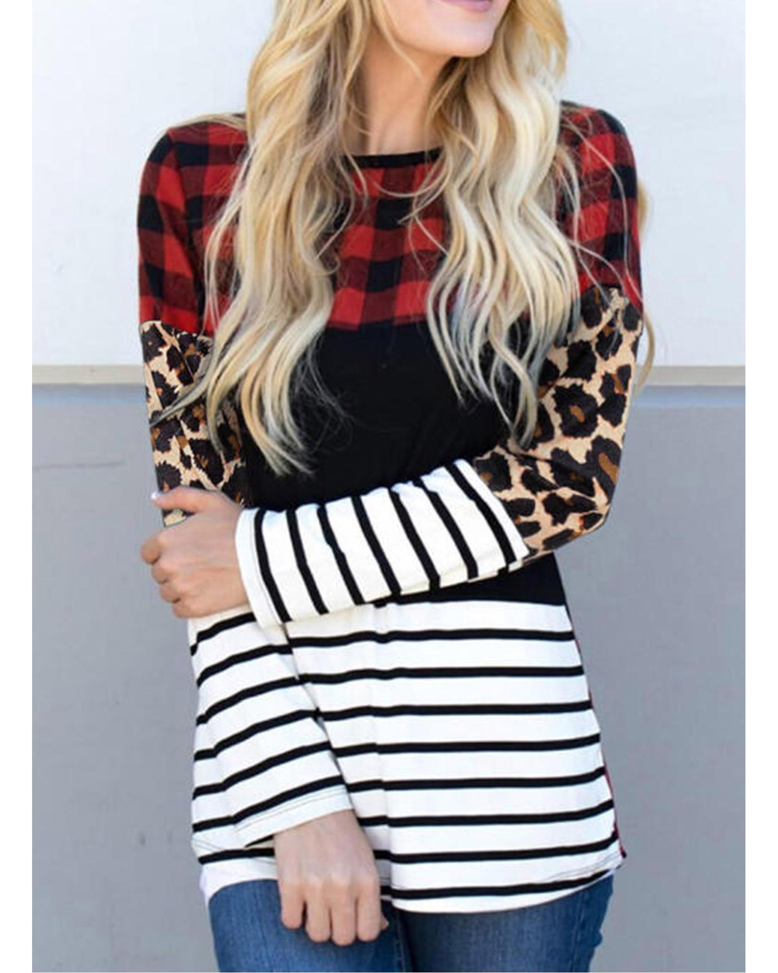 Plaid Print Leopard Splicing Striped Color Block Long Sleeve Top – XL