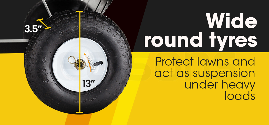 Thesteel chassisis built to handle the knocks of daily use and to stay stiff over bumps, and through ditches. The massive 13″ pneumatic tyres are perfect for carting across lawns, through soil, and mud. Their round 3.5″ wide treadis designed for manoeuvrability, and are gentle on soft terrains.