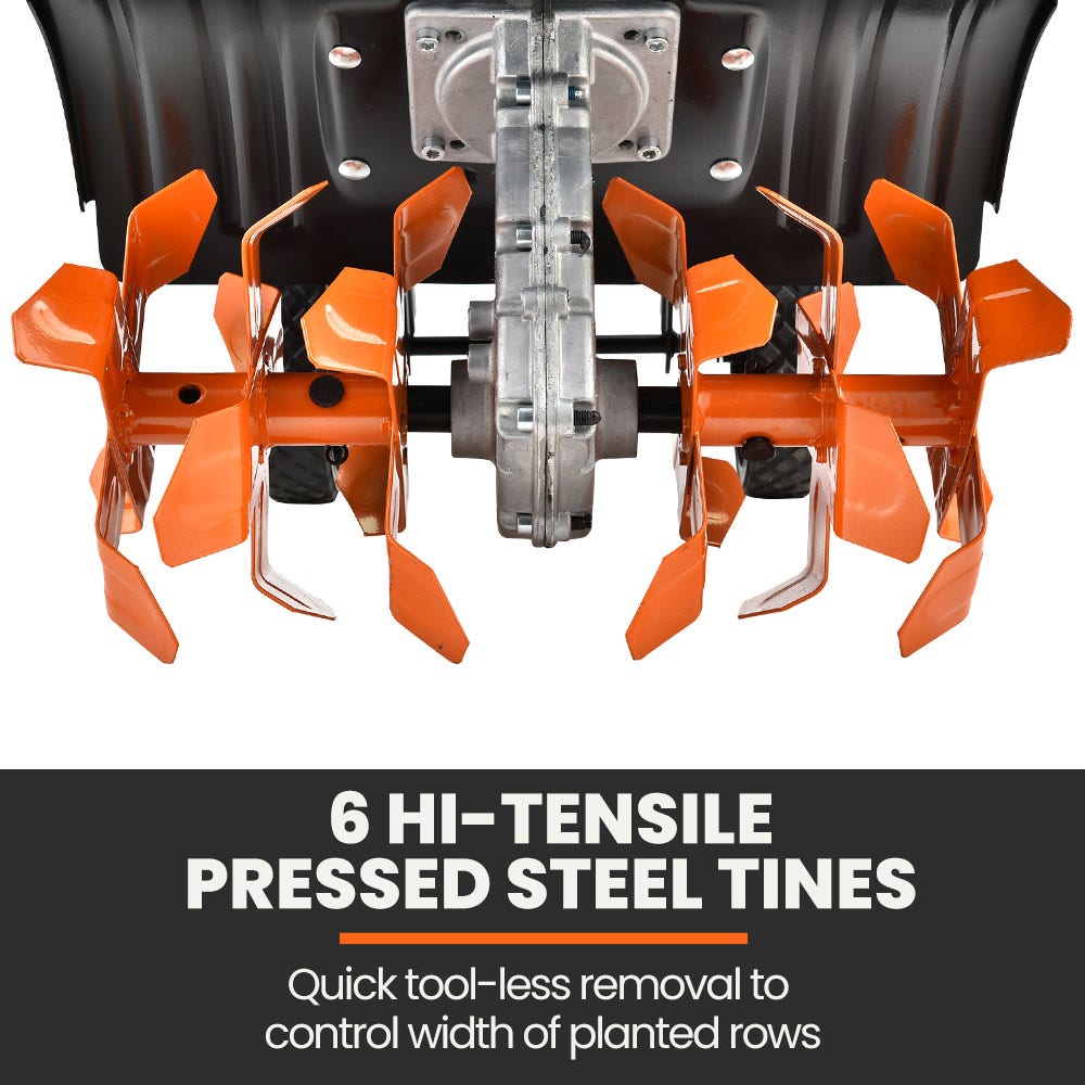With 26 hi-tensile pressed steel tines you can reach a depth of up to 200mm and a maximum tilling width 400mm (15″), so you’ll generally only need one pass to finely mill your soil for better preparation and growth. The blades are removable without the need for tools so that you can adjust the width to suit the planted rows, or to remove roots or debris.