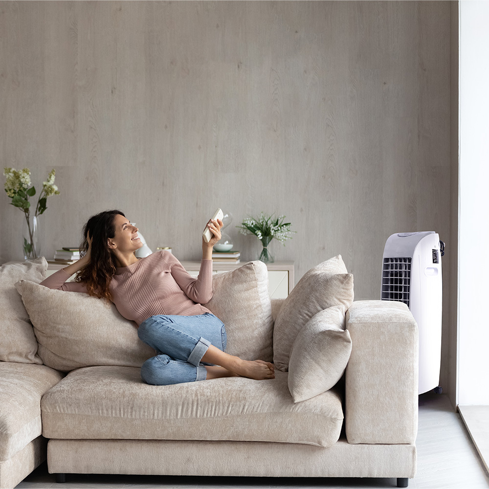 The evaporative cooling process produces cool air by cycling the water, which is up to 6 times more energy efficient than traditional air conditioners! As air is drawn through the filter it gets purified and freshened. You also have the flexibility to position it anywhere as it requires no window ventilation ducting.