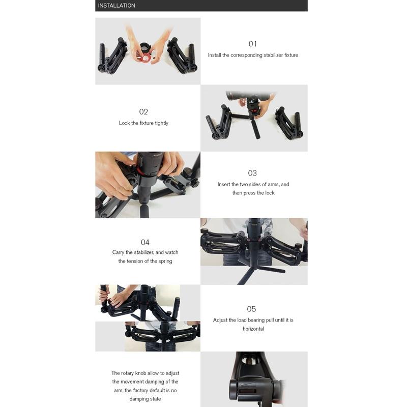 • Separated structure design, the arms allow to remove, convenient to carry your gimbal upside down. The 1/4 inch screw holes on sides and grip allow to mount strap, light, Microphone, monitor or other device.