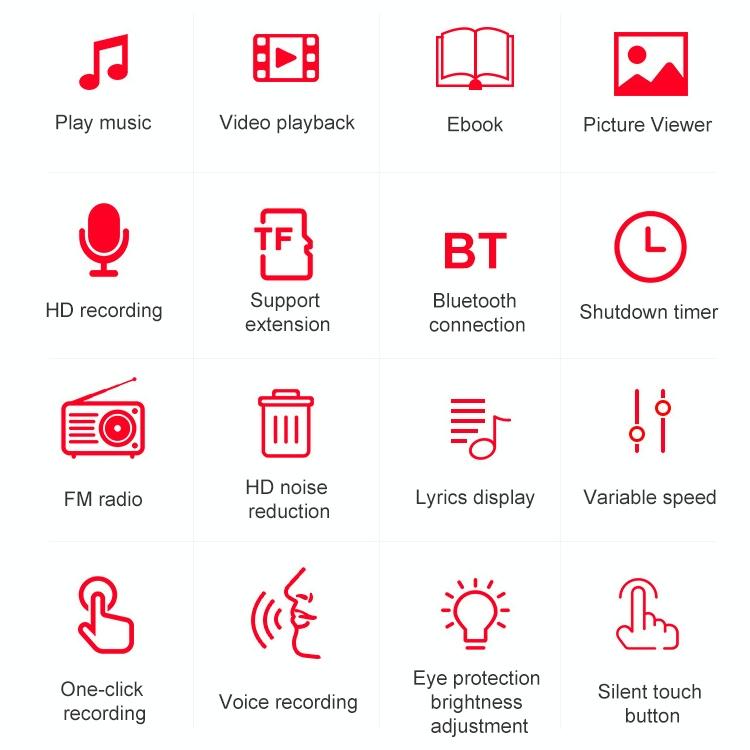 • Additional functions include Bluetooth, picture browsing, and e-book reading