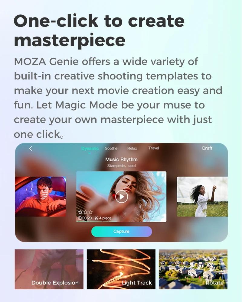 • MOZA Genie offers built-in creative shooting templates for easy and fun movie creation