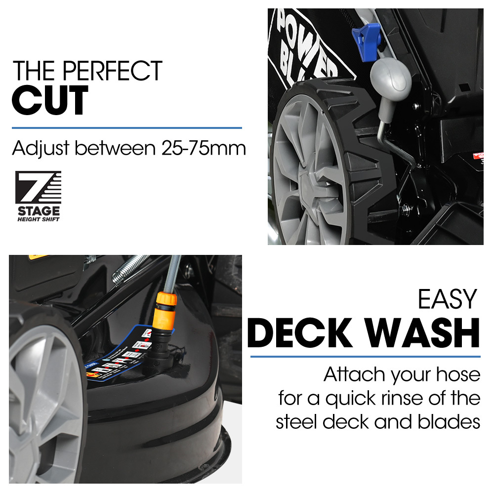PowerBlade 22″ 224cc Self-Propelled Lawn Mower, Electric Start, 7 Height, Steel Deck, Deck Wash Port, OHV 4-Stroke Petrol – VS1000