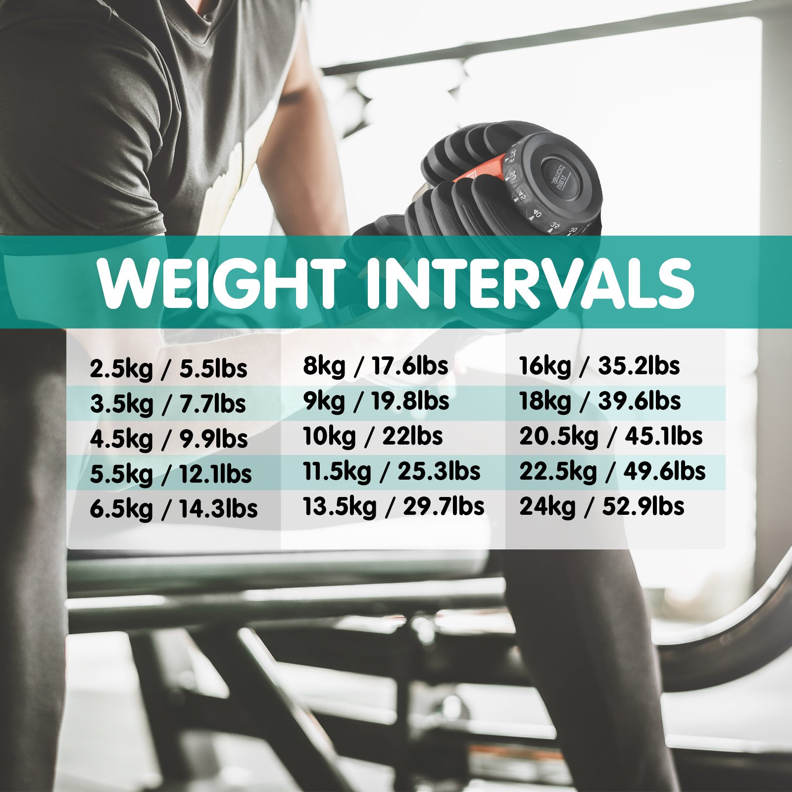 • Weight range: 5-52.5lb (2.3-24kg) each