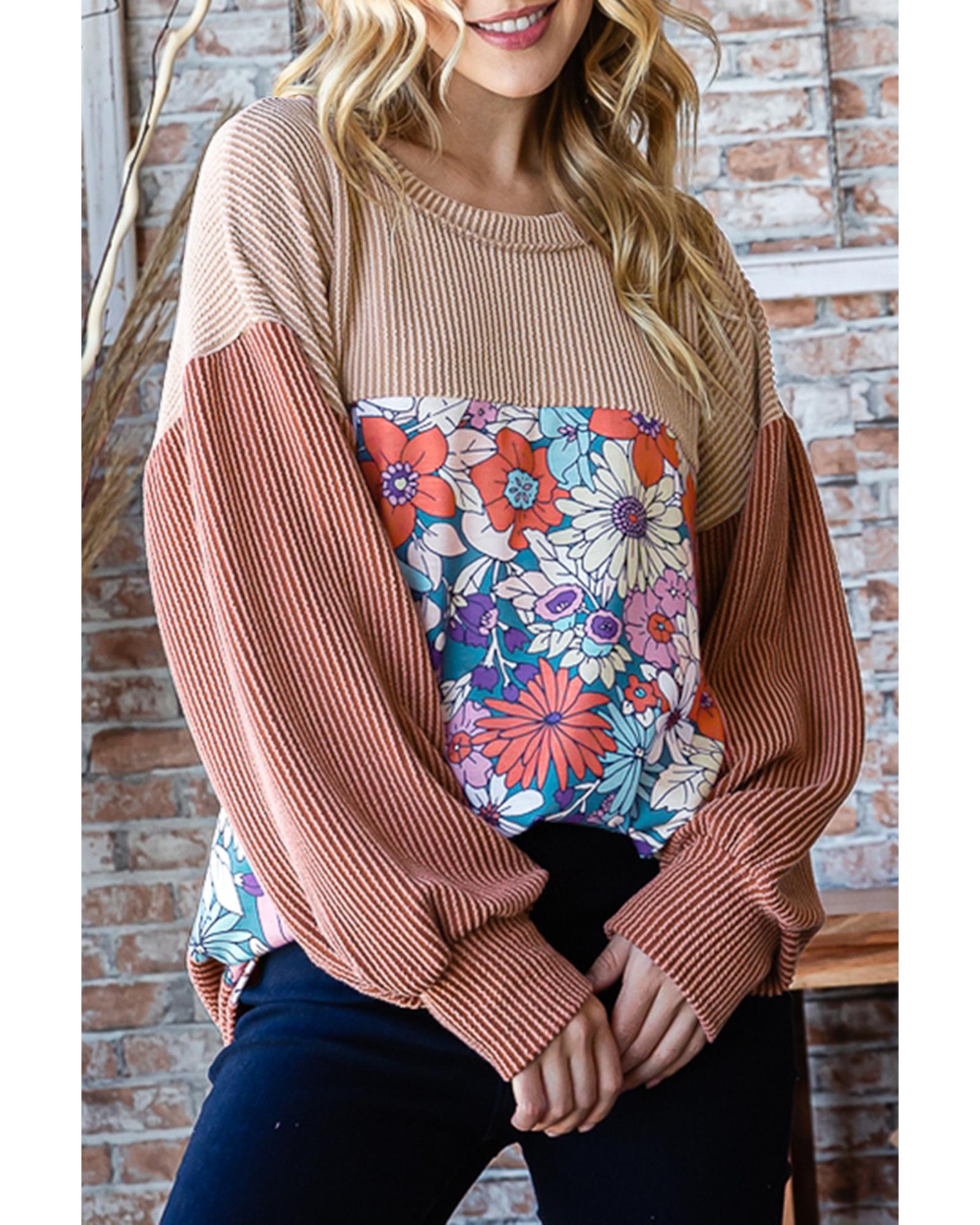 Printed Floral Contrast Colorblock Ribbed Top – L