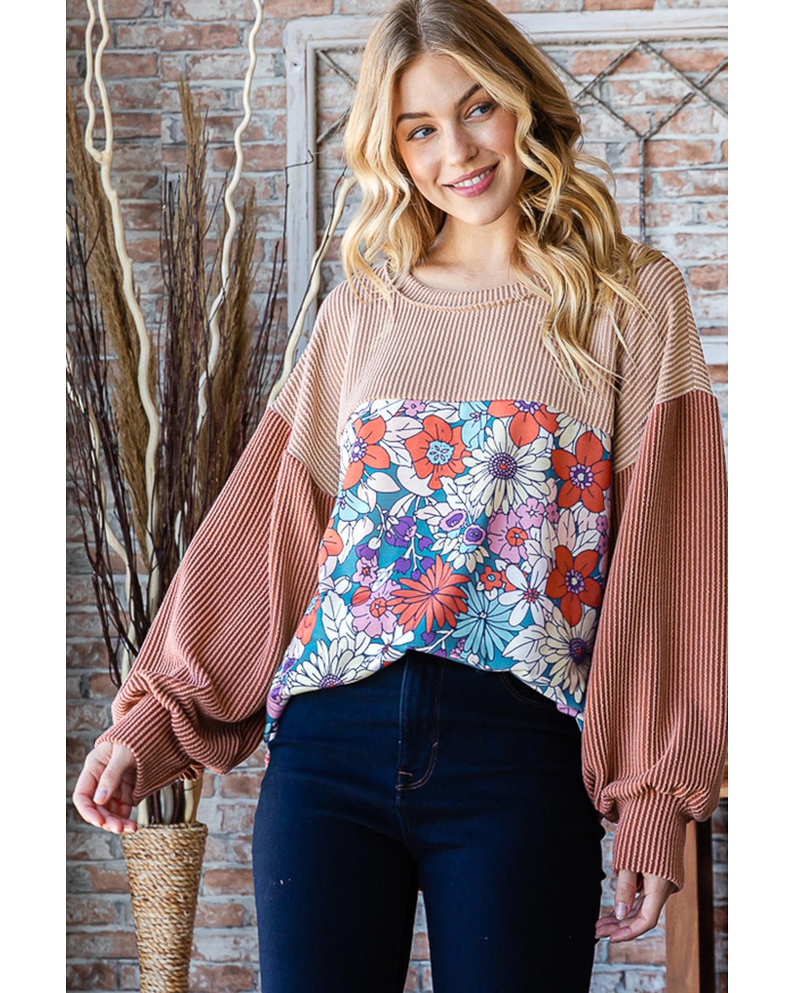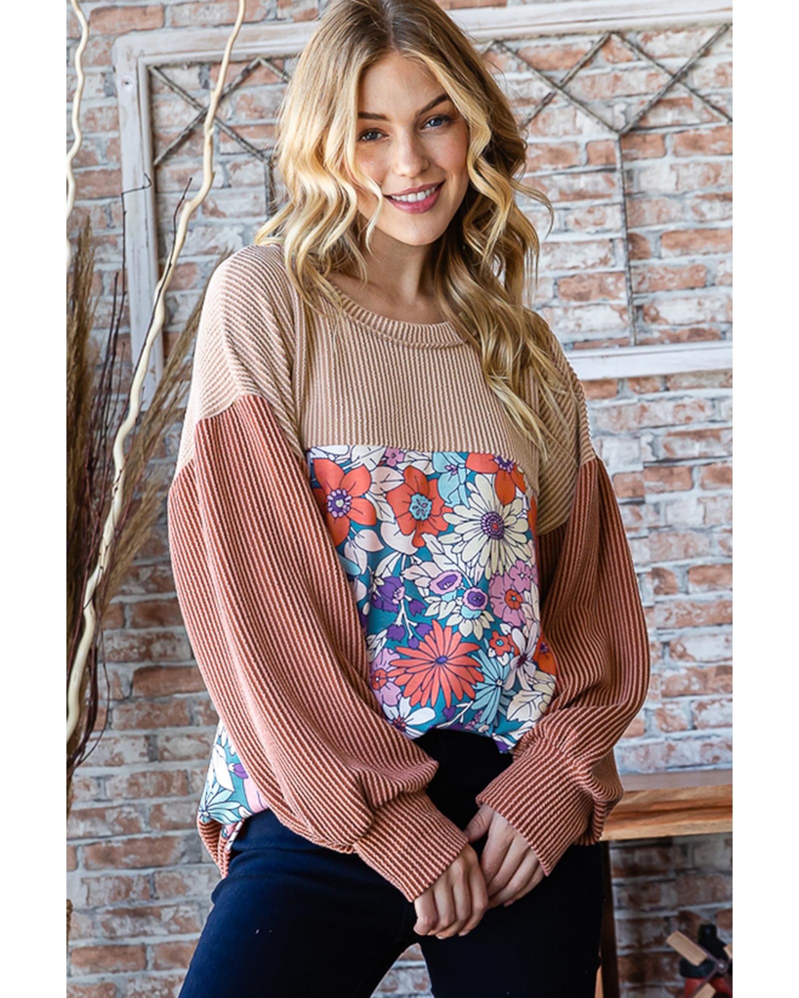 Printed Floral Contrast Colorblock Ribbed Top – S
