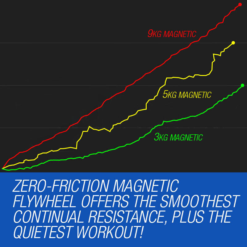 The build quality is second to none within its class. The thick steel frame is powder coated and rustproof. The EXB1 takes up less than a square metre of floor space and stands on rubber feet to protect flooring, and of course features the most superior technology available: Magnetic resistance. With a heavy-duty magnetic flywheel there is absolutely no friction in the drivetrain, which not only means zero wear and tear, but you’ll also experience the smoothest, continual resistance for a low impact workout. It also ensure you’ll have the quietest workout, which is great for when you’ll wheel it out to enjoy your favourite TV show!