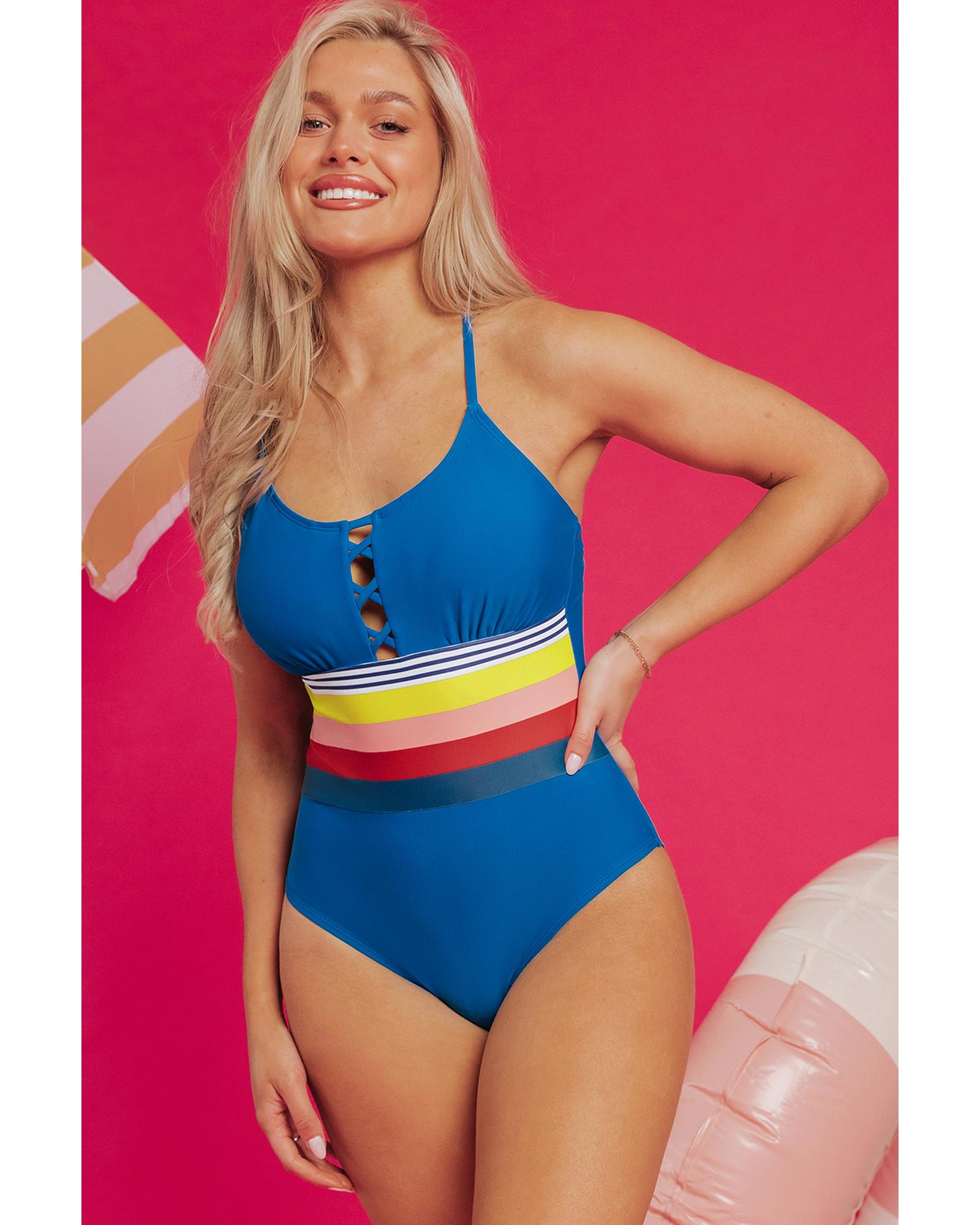 - Prussian Blue Contrast Stripe Accent Crisscross One Piece Swimwear