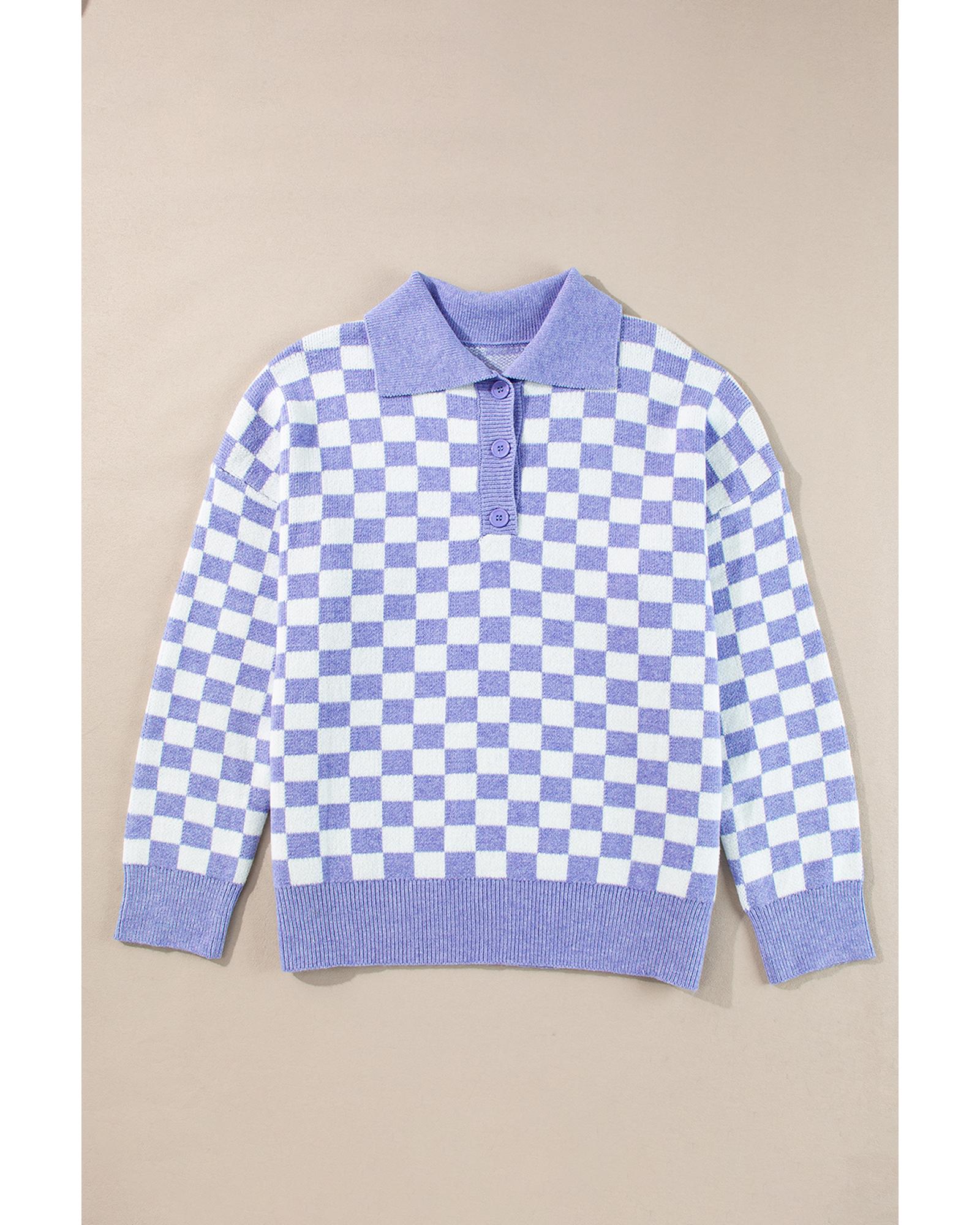 Purple Checkered Collared Buttons Plus Size Sweater – 1X
