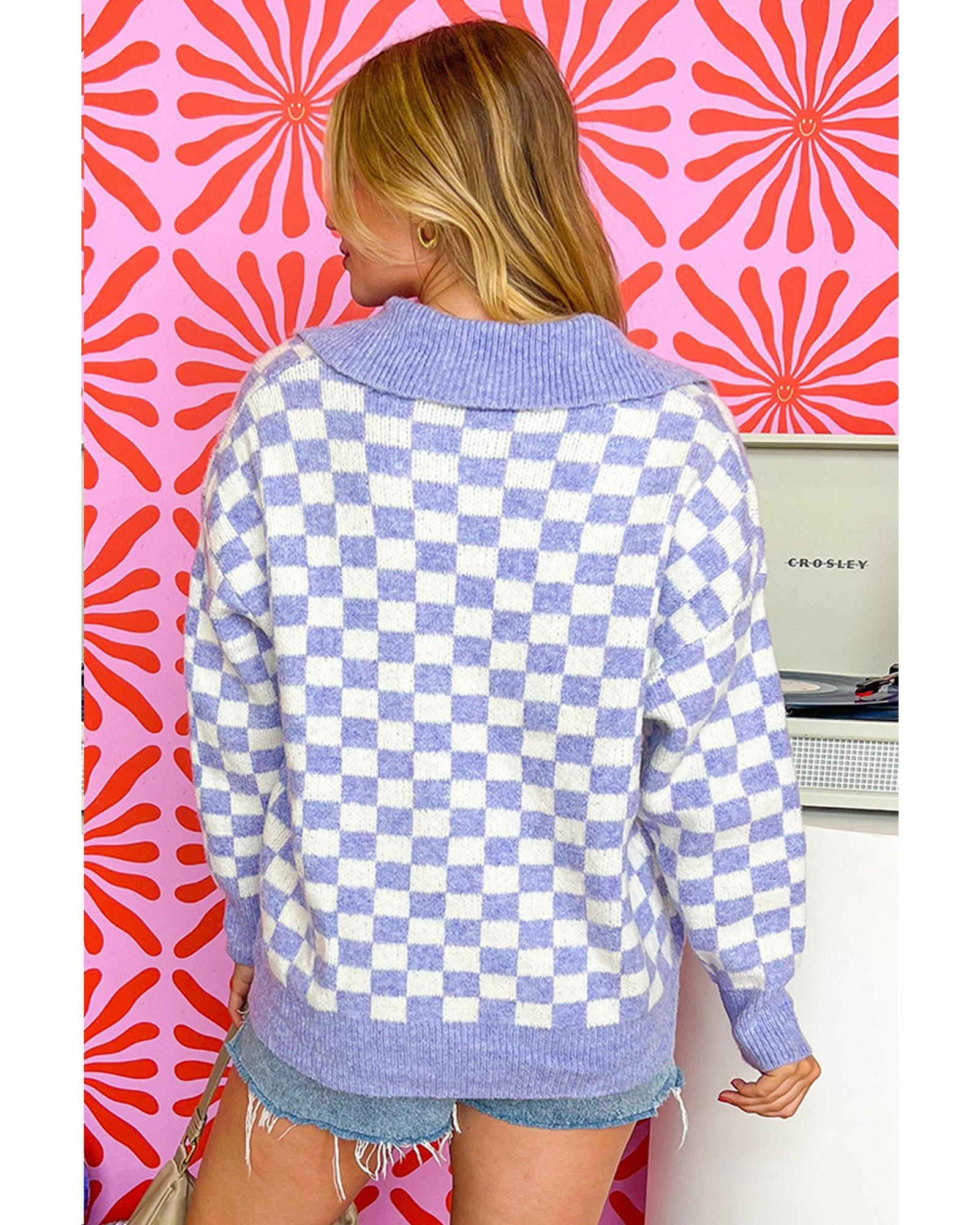 Purple Checkered Collared Buttons Plus Size Sweater – 2X