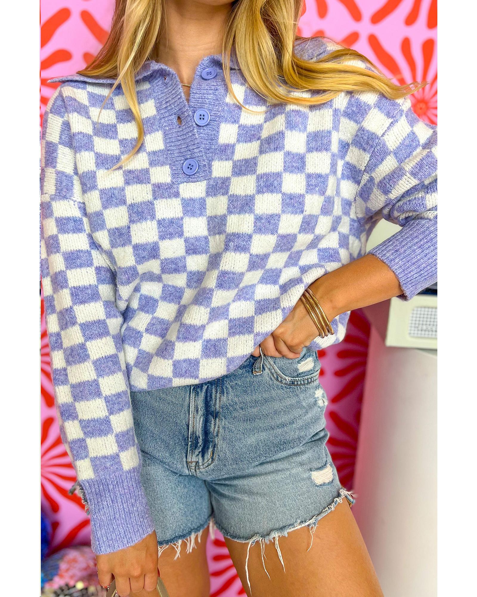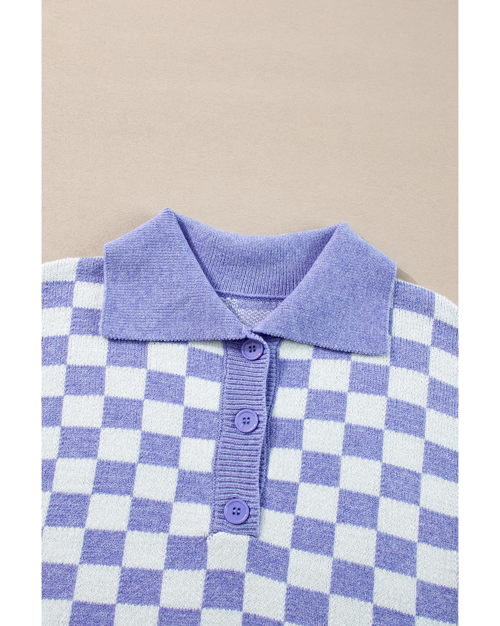 Purple Checkered Collared Buttons Plus Size Sweater – 3X