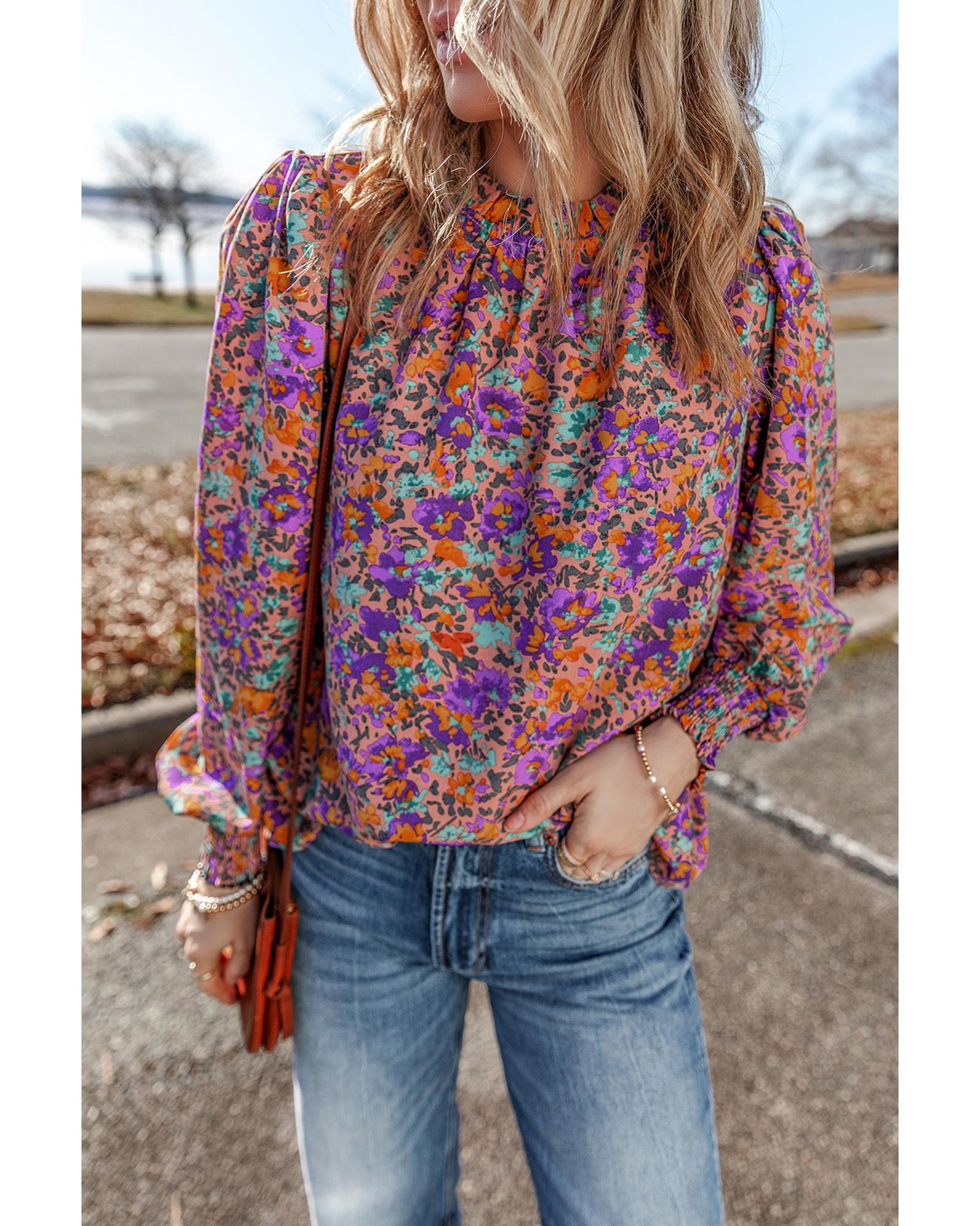 Purple Floral Allover Print Shirred Cuff Frilled O Neck Blouse – S