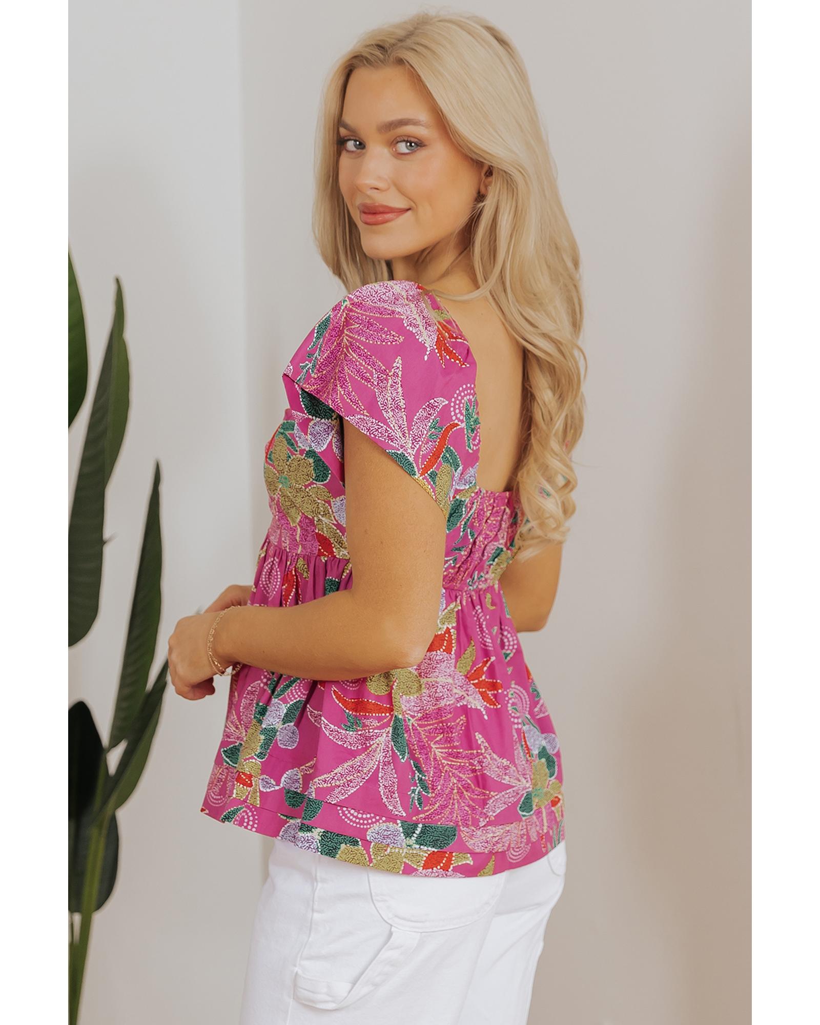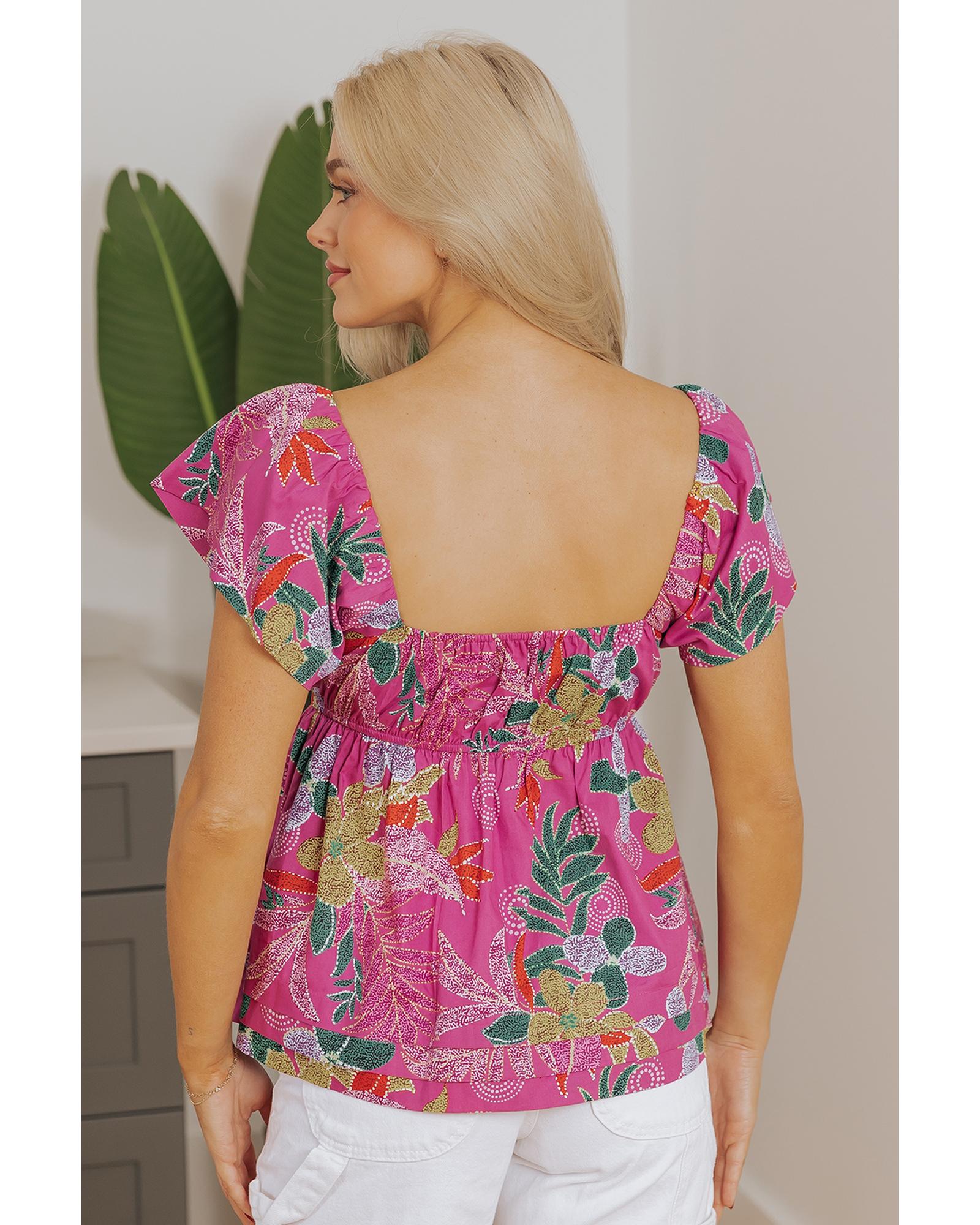 Purple Floral Print Sweetheart Neck Flutter Sleeve Blouse – S