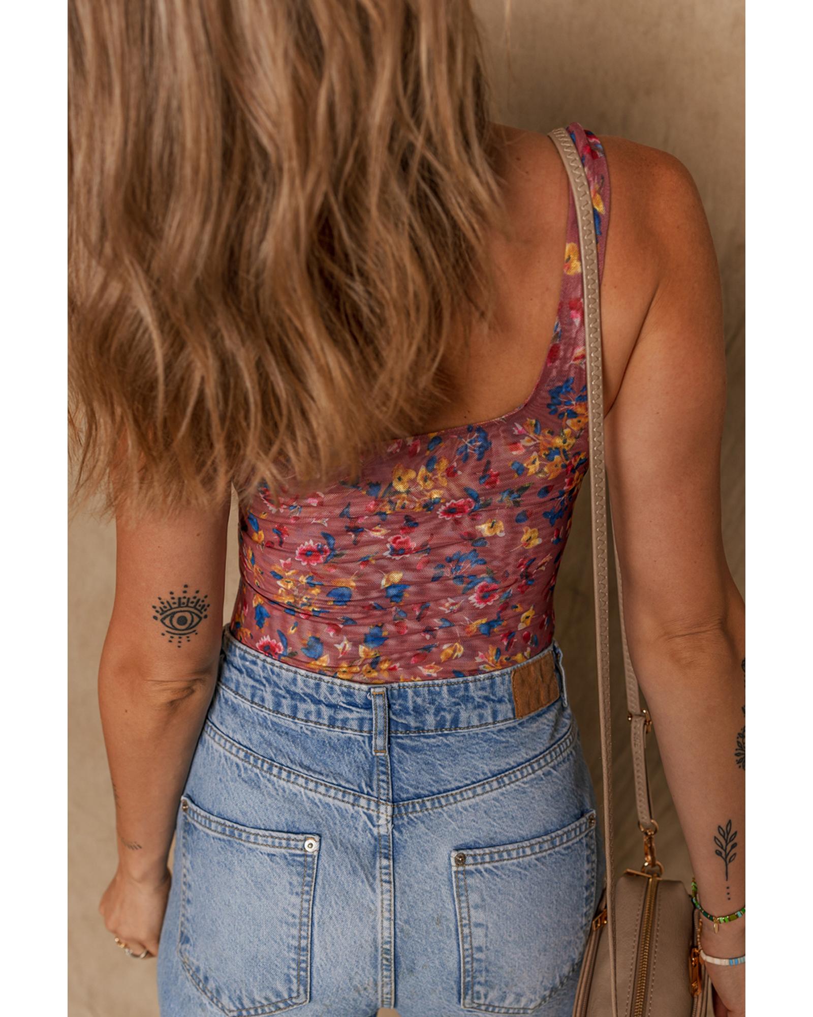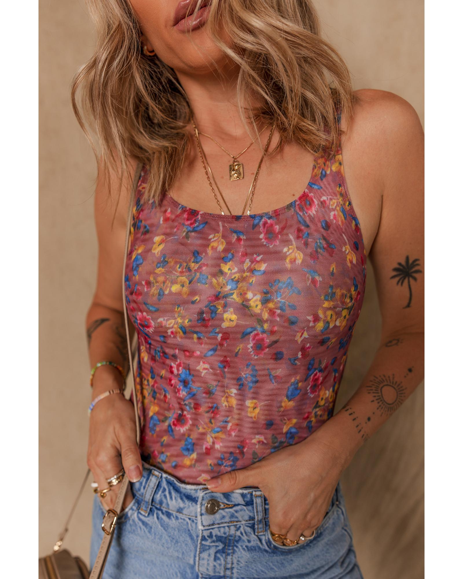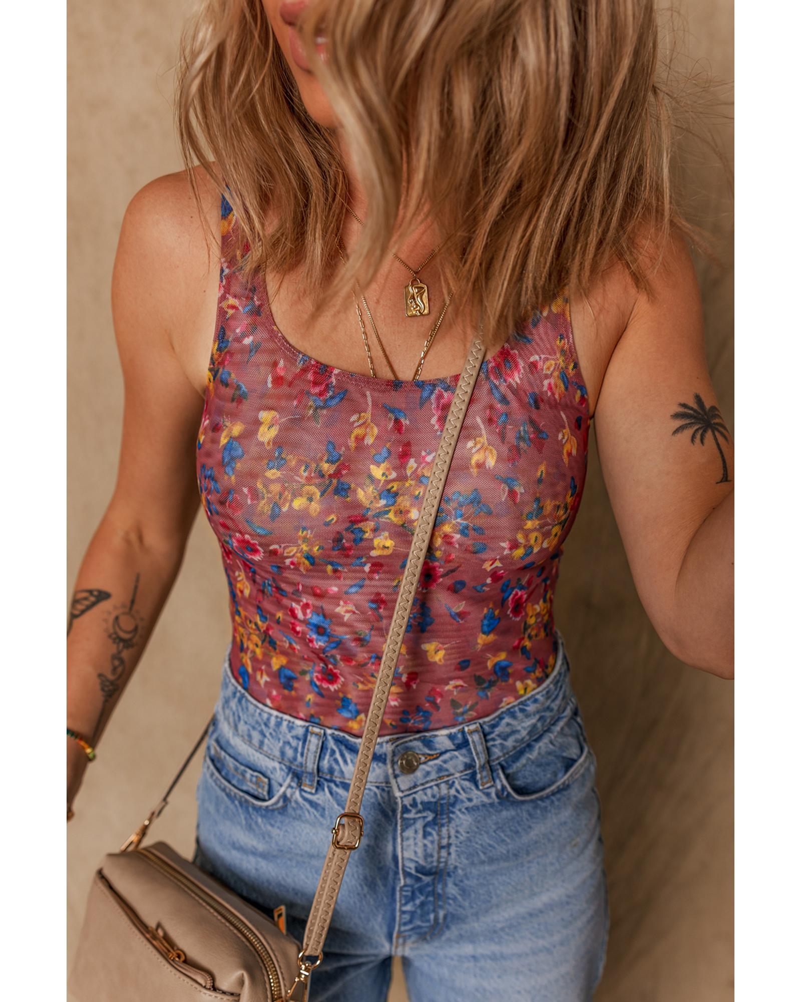 Purple Floral Printed Mesh U Neck Sleeveless Bodysuit – M