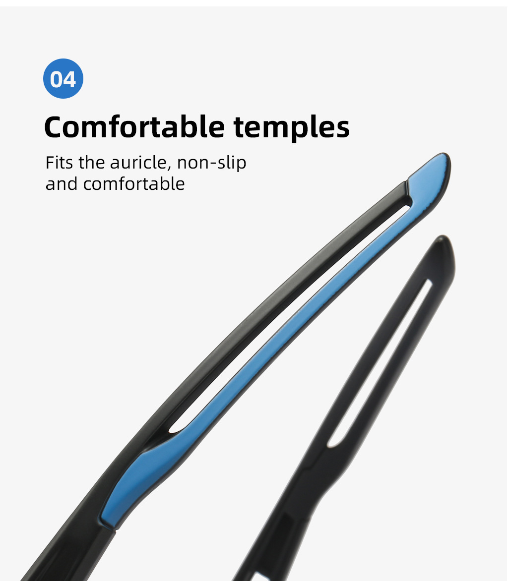 • Secure & Non-Slip Temples: Ergonomically designed temples fit snugly and comfortably around the auricle, providing a secure, non-slip grip even during intense movement.