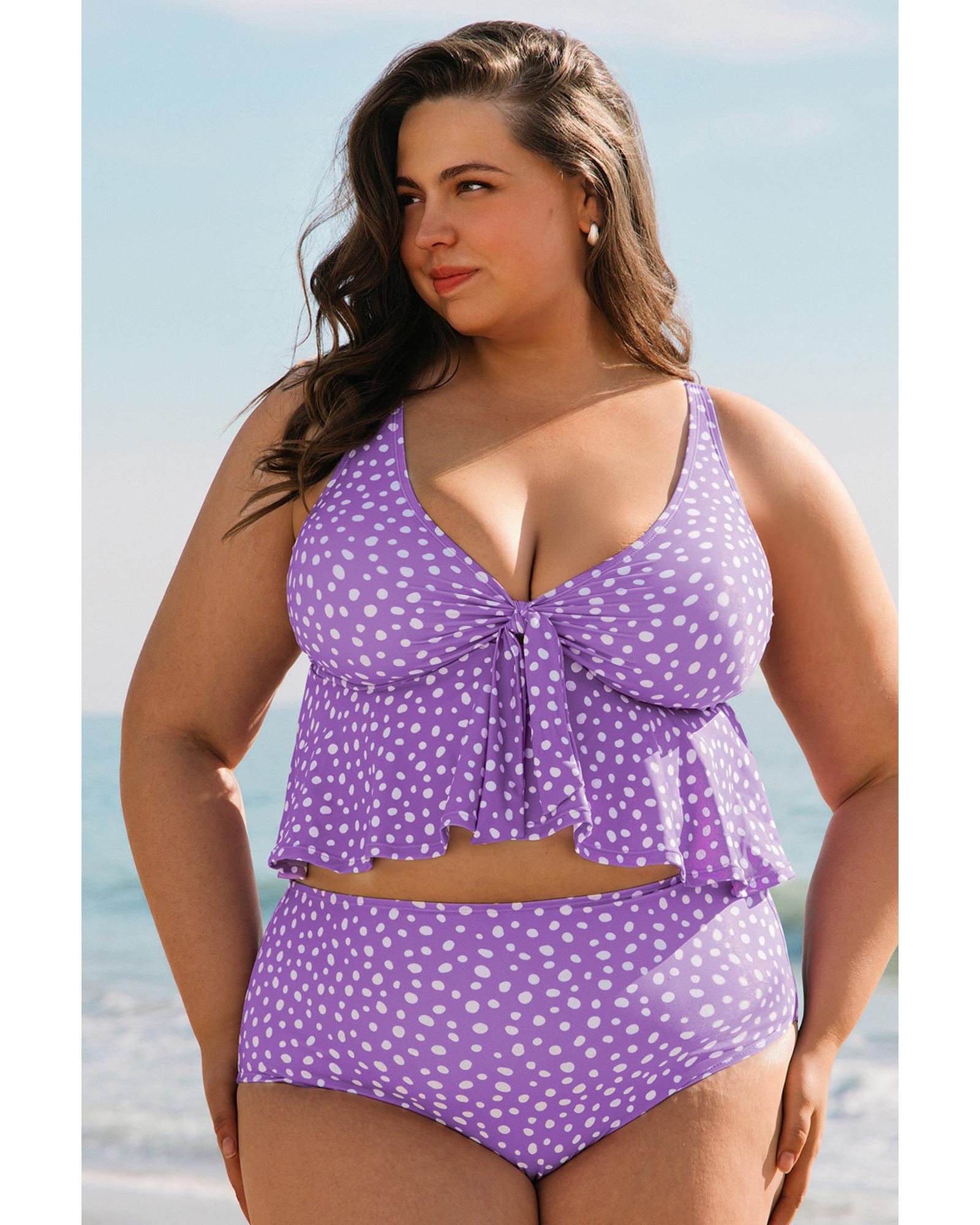 - Purple Plus Size Polka Dot Print Ruffled Knotted V Neck Tankini Set