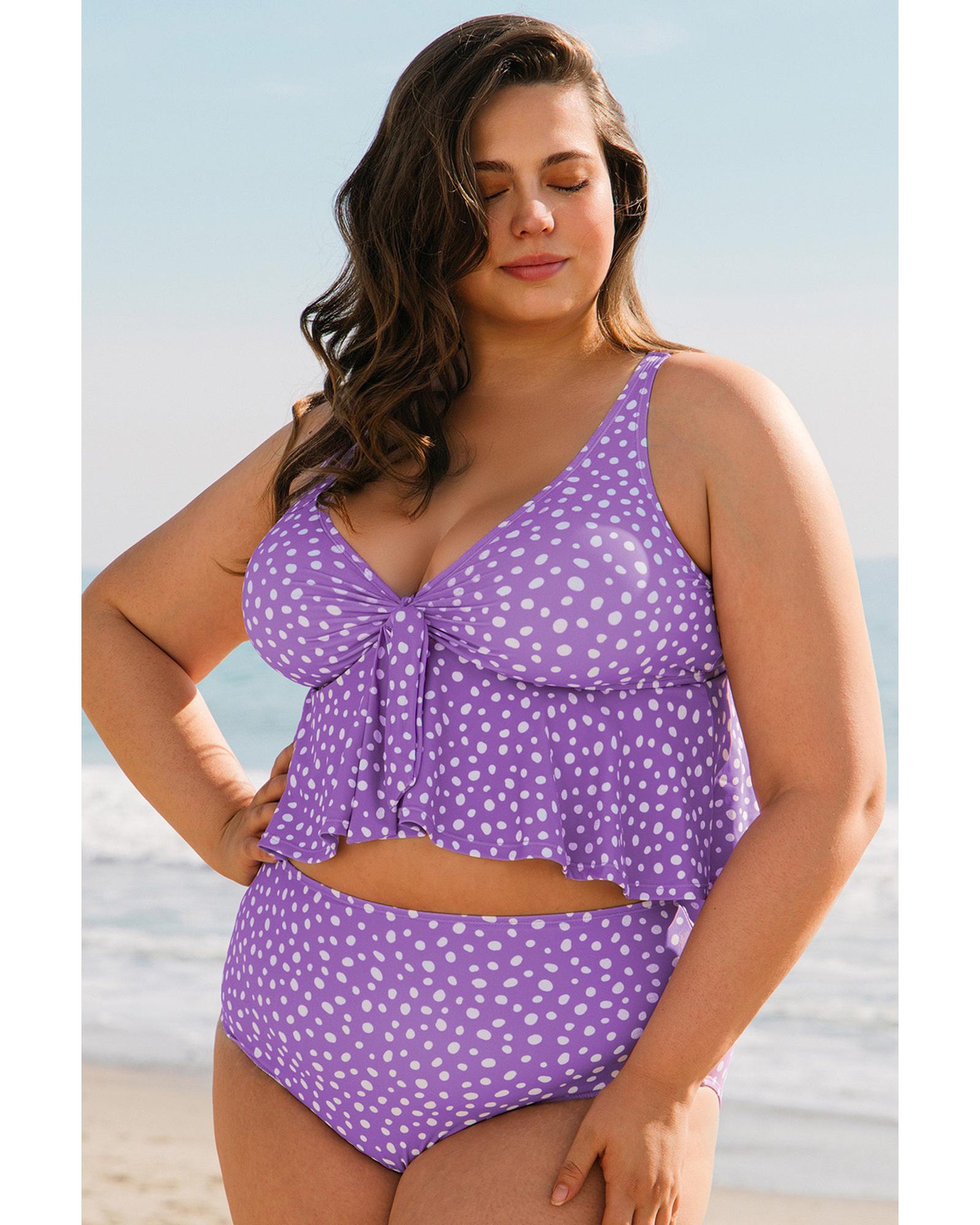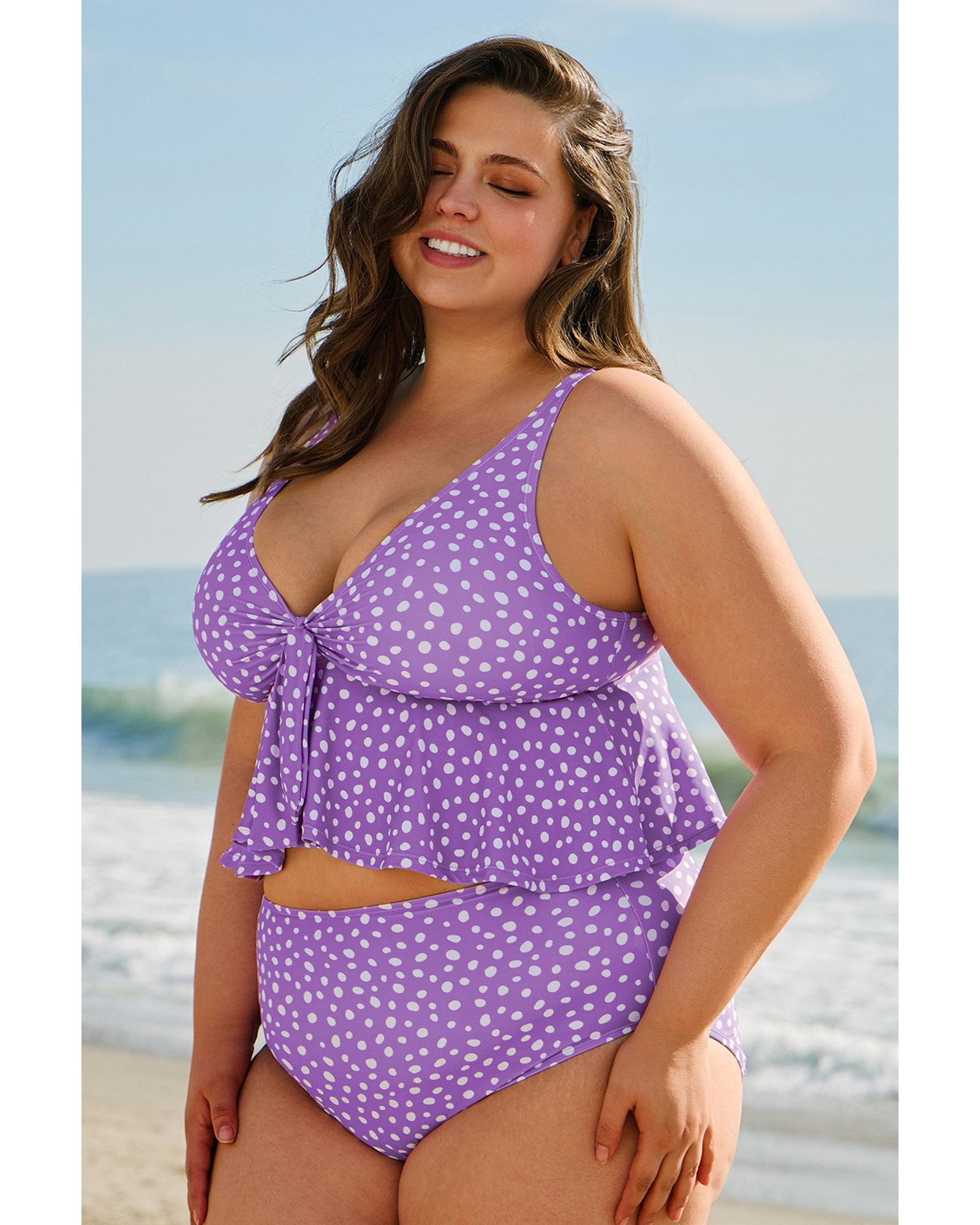 • Purple Plus Size Polka Dot Print Ruffled Knotted V Neck Tankini Set