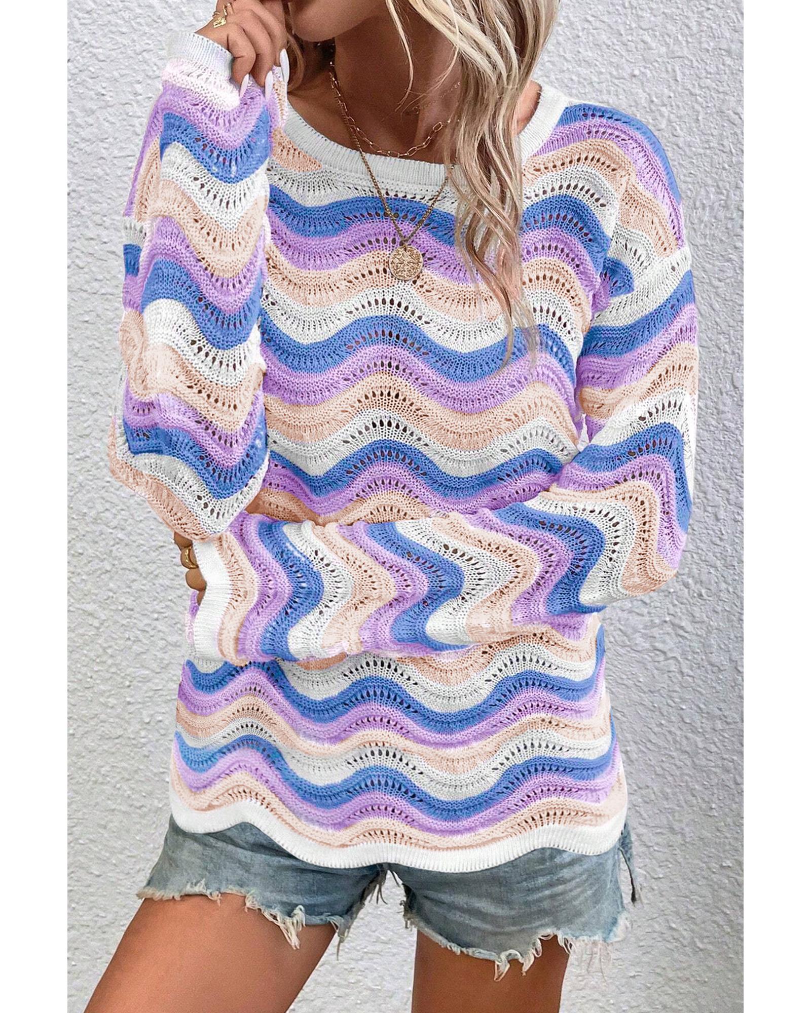 Purple Stripe Wavy Pointelle Knit Drop Shoulder Sweater – L