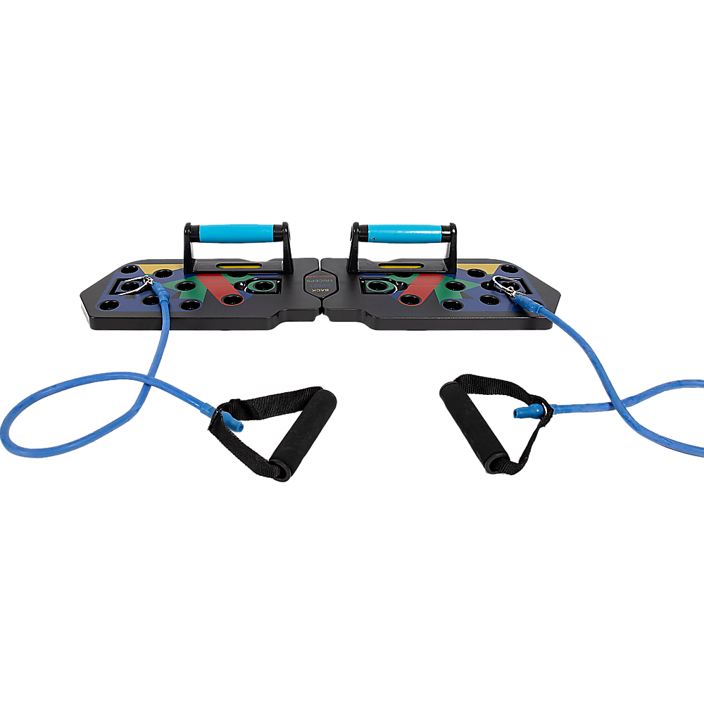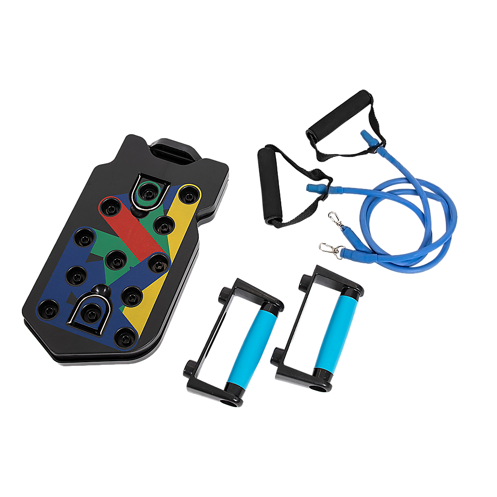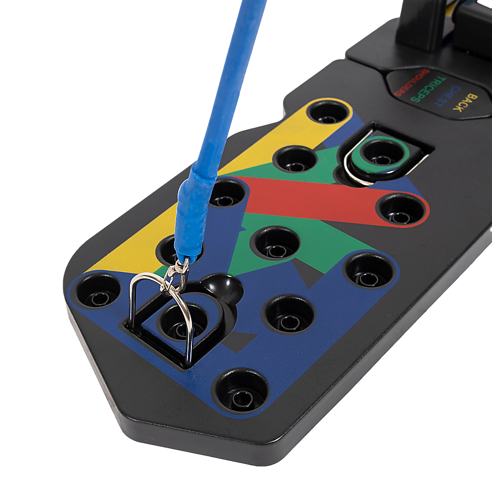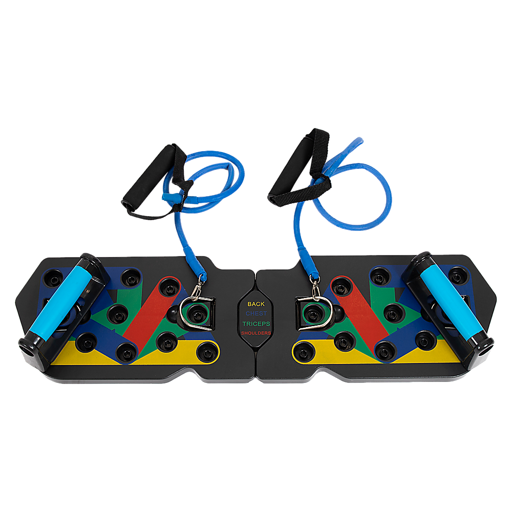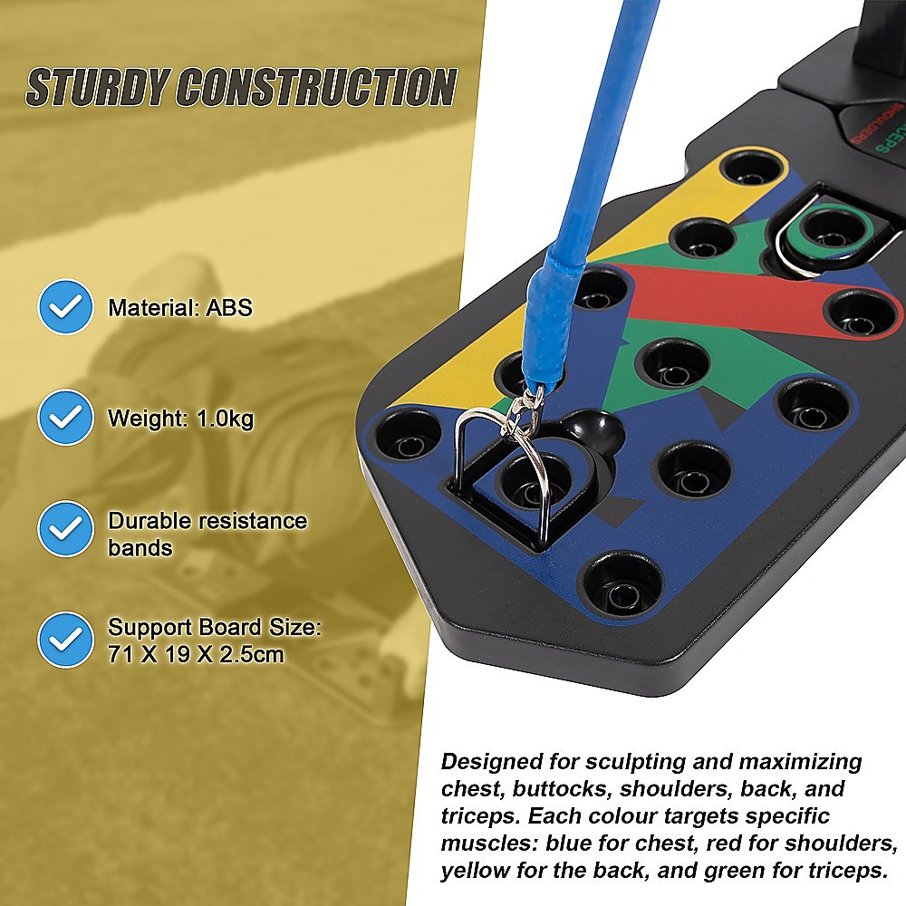Experience the advance and enhanced 13-in-1 push up bars with resistance bands. Designed for sculpting and maximizing chest, buttocks, shoulders, back, and triceps. Each colour targets specific muscles: blue for chest, red for shoulders, yellow for the back, and green for triceps.