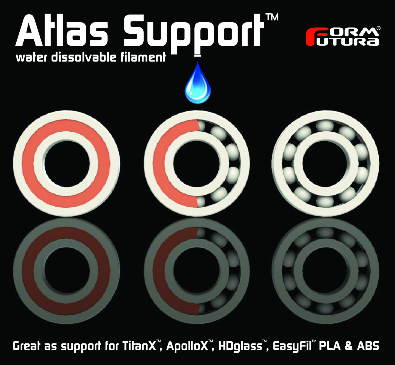 Atlas Support is the next generation in PVA water-soluble support materials for FFF/FDM 3D printing. Atlas Support is the result of extensive research to PVA improvement which has resulted in an unique formulation where numerous PVA grades have been blended into one superior water soluble support material with improved thermal stability.