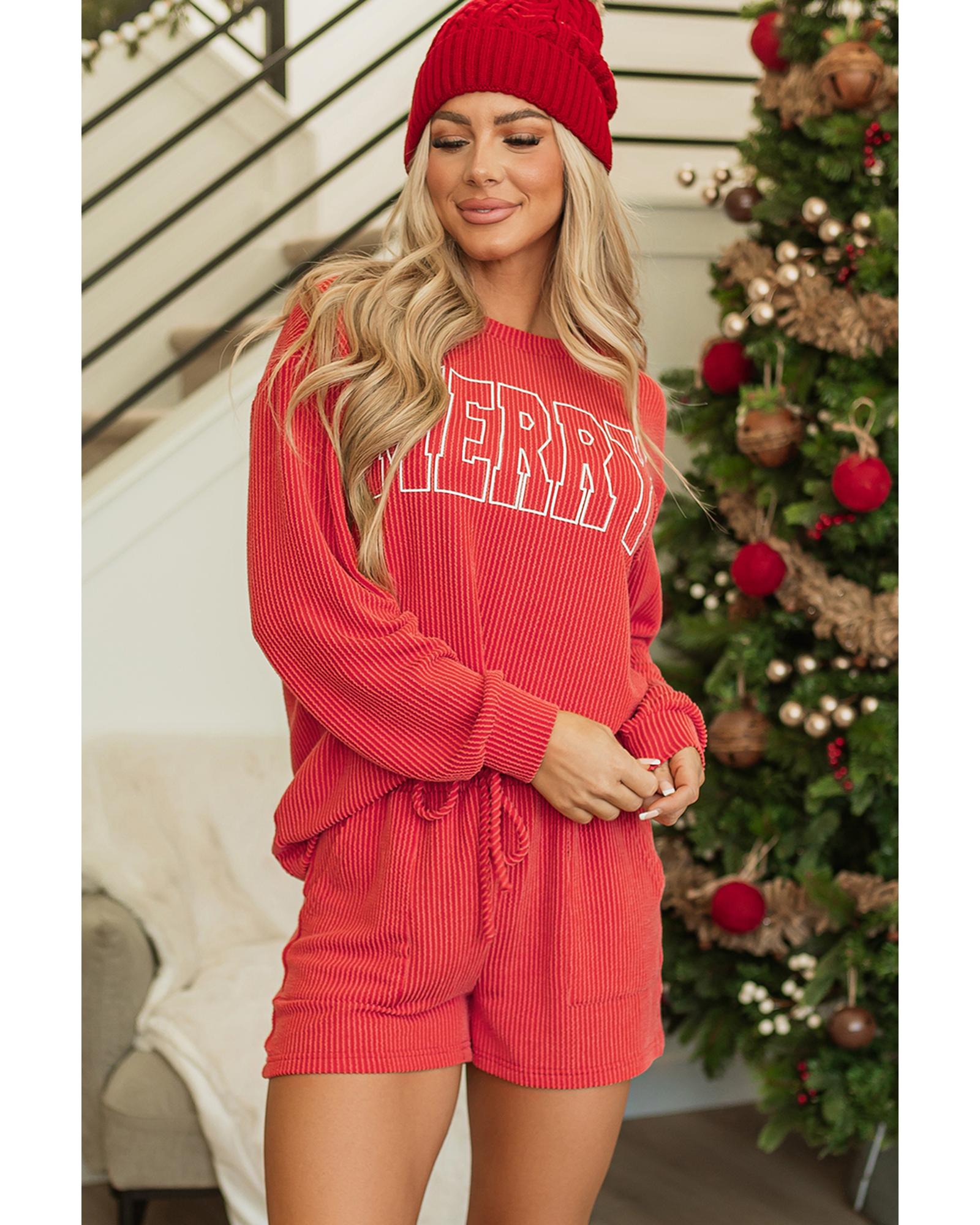 - Racing Red Corded MERRY Graphic Long Sleeve Top and Shorts Set