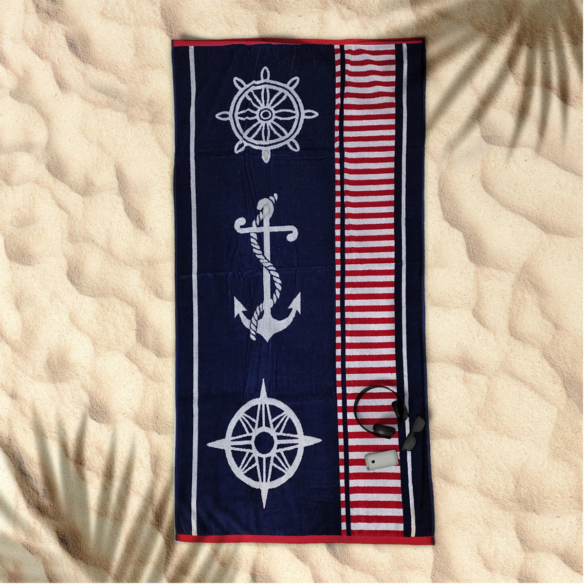 This eye-catching 400GSM Premium Cotton Yarn Dyed Velour Jacquard Reversible Beach Towel 86 x 160 cm will make a perfect summertime accessory for your next beach adventure. It features jacquard nautical design in vibrant colour tones that will make you stand out at the beach. This beach towel is designed in Australia and made from ultra absorbent and durable 100% premium cotton fabric. Yarn dyed velour.