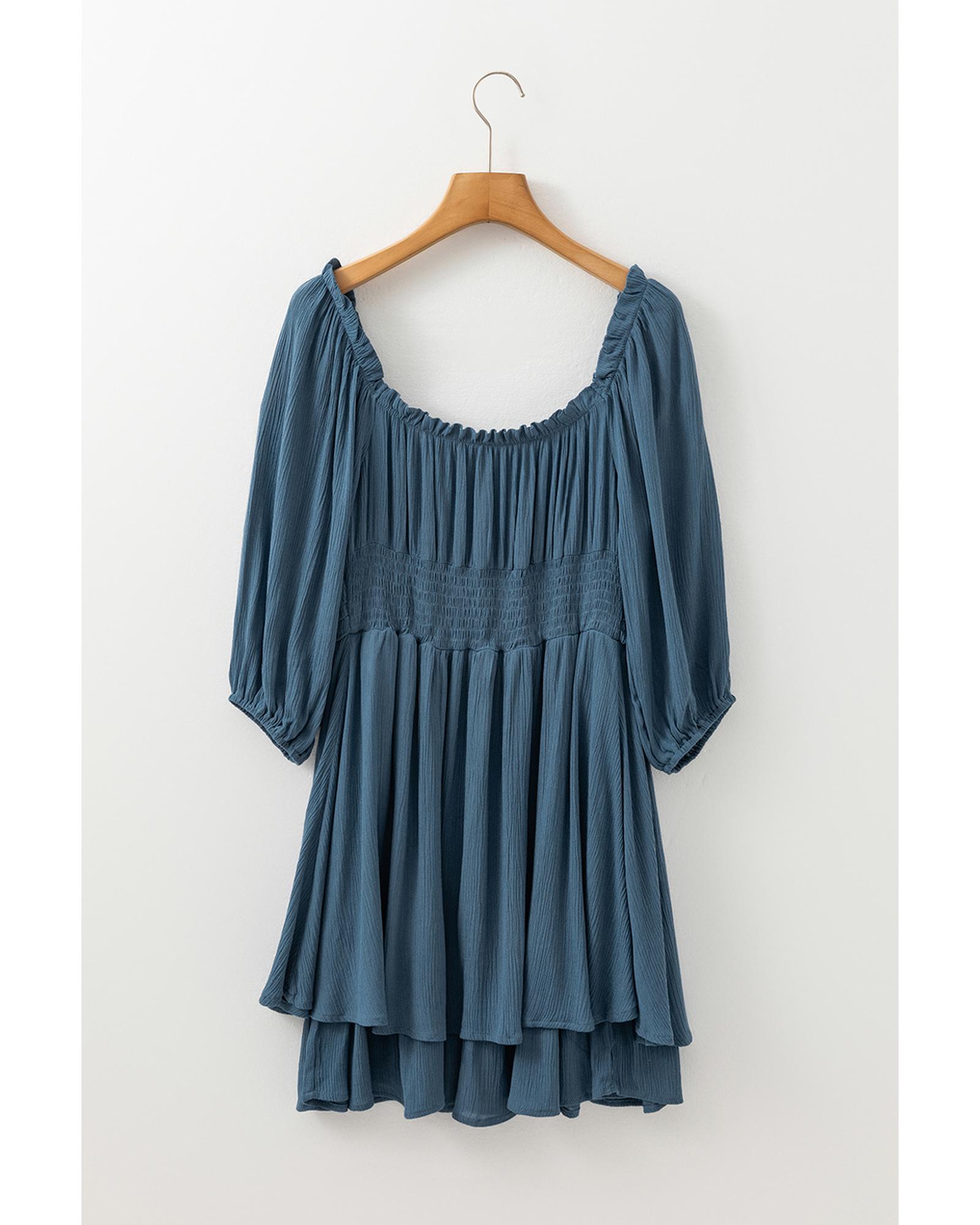 Real Teal Frilled Neckline 3/4 Sleeve Layered Ruched Mini Dress – L