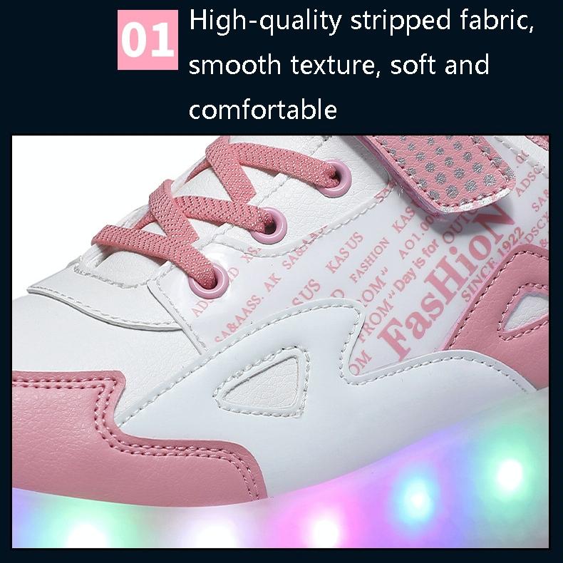 • Stylish design with middle stripped fabric and transparent TPU sole with lighting