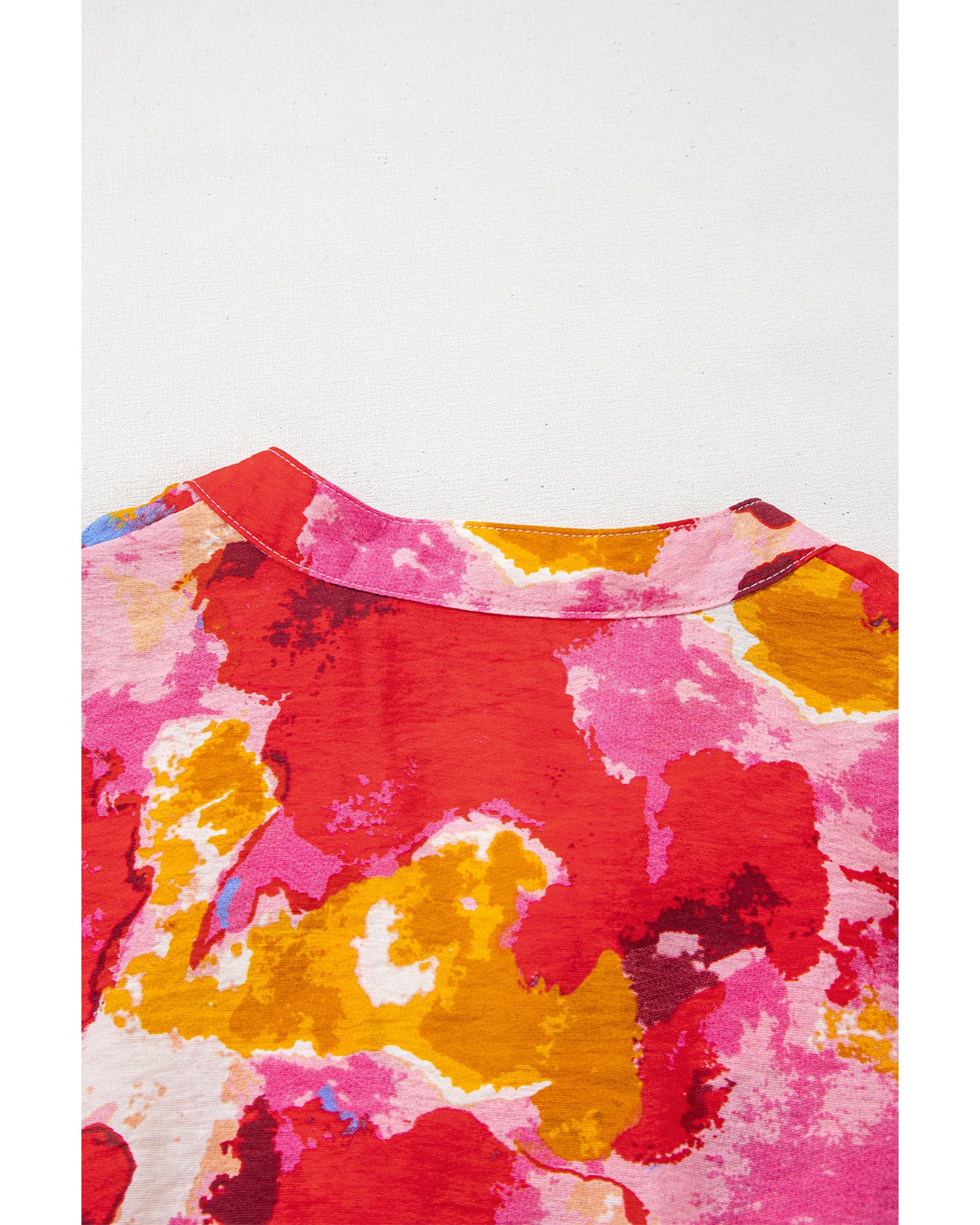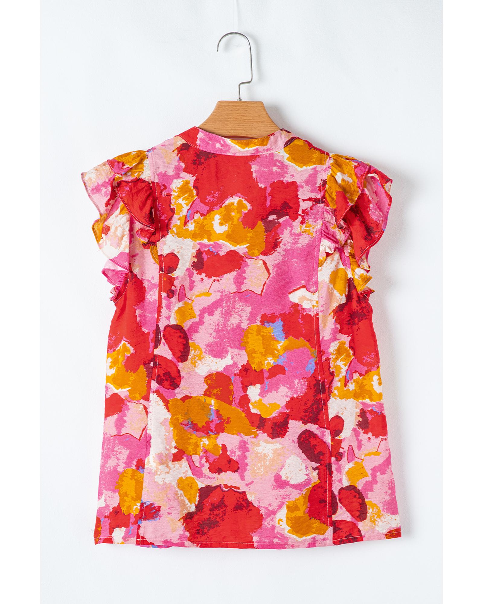 Red Abstract Print Split V Neck Ruffle Short Sleeve Blouse – M