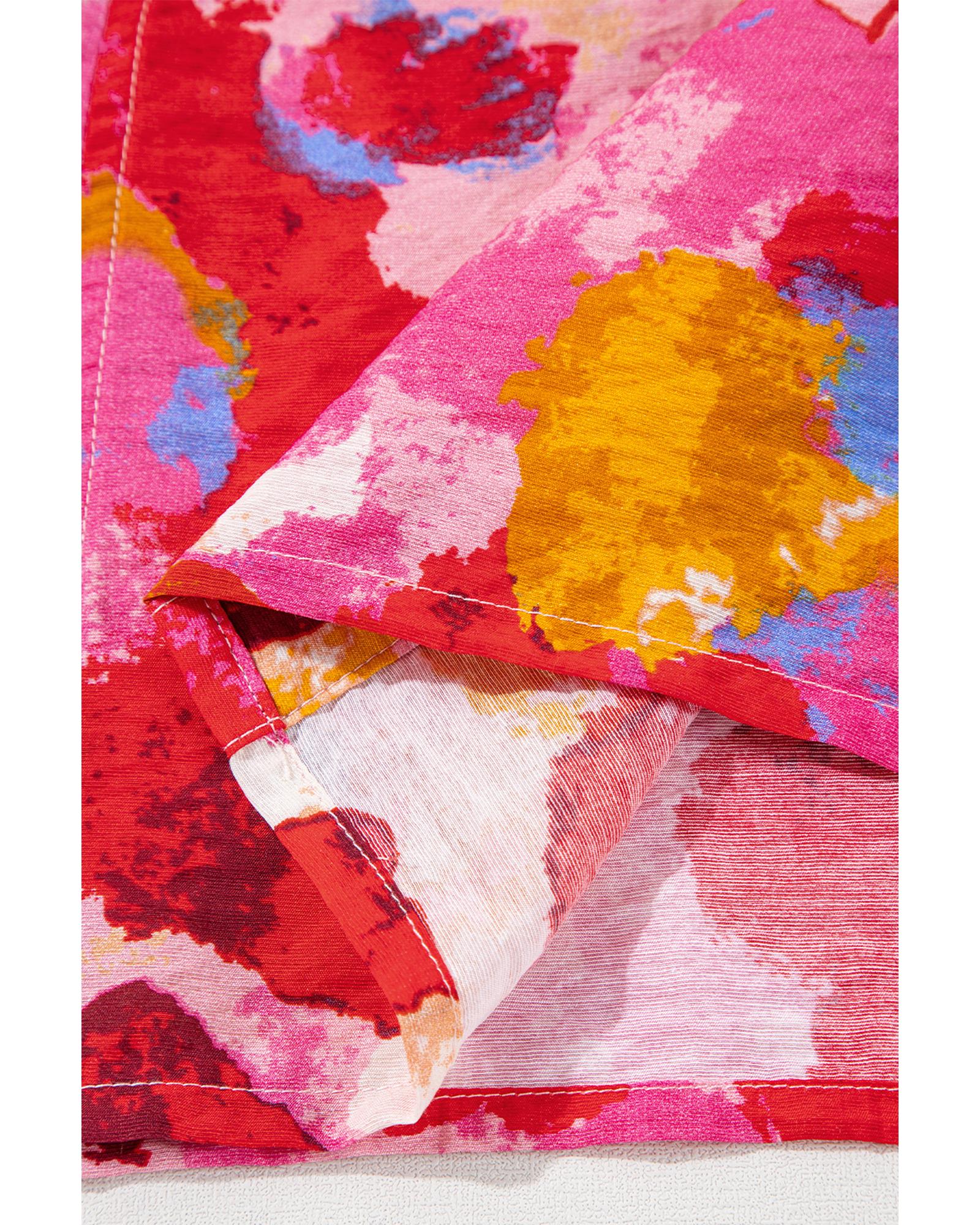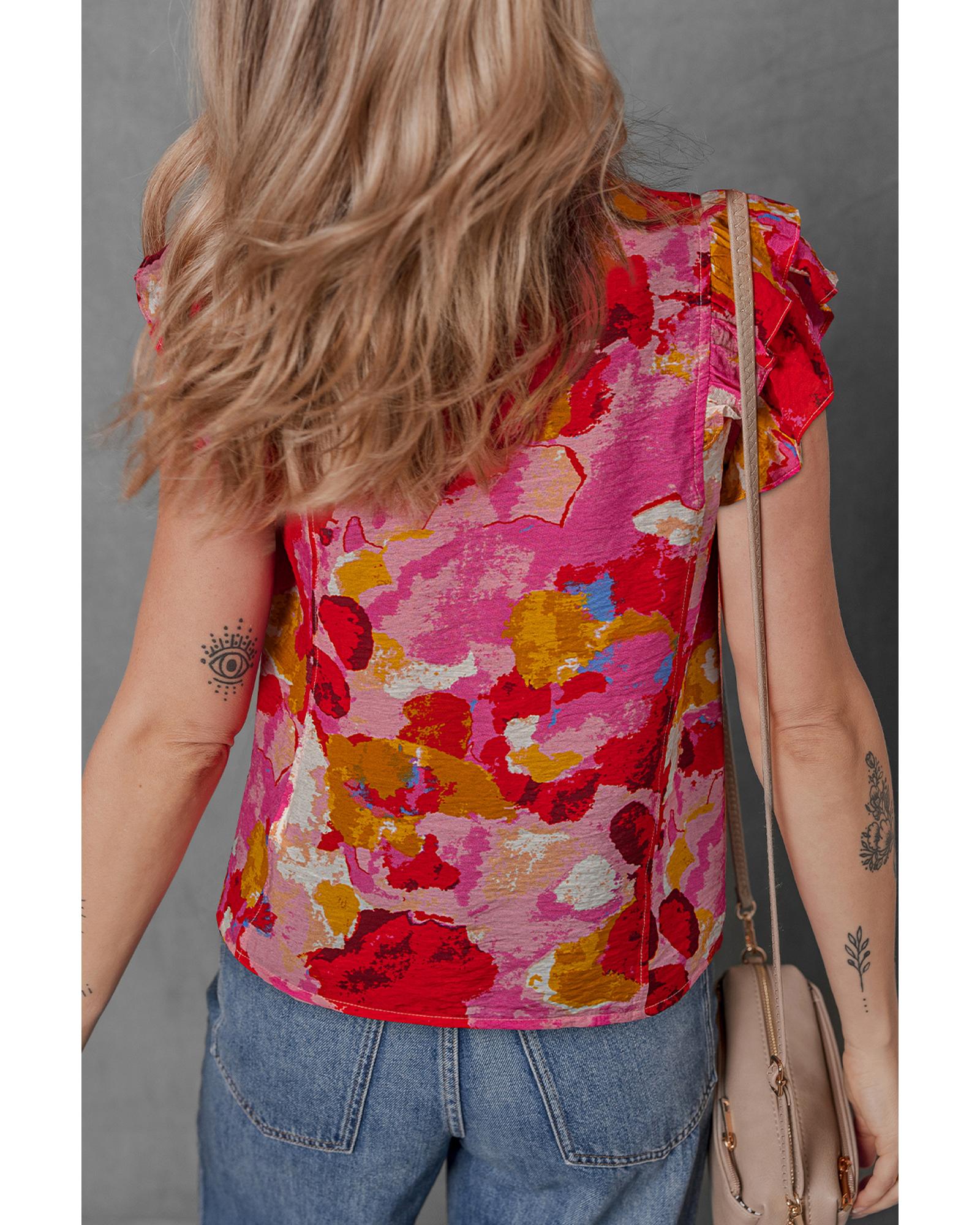 Red Abstract Print Split V Neck Ruffle Short Sleeve Blouse – S