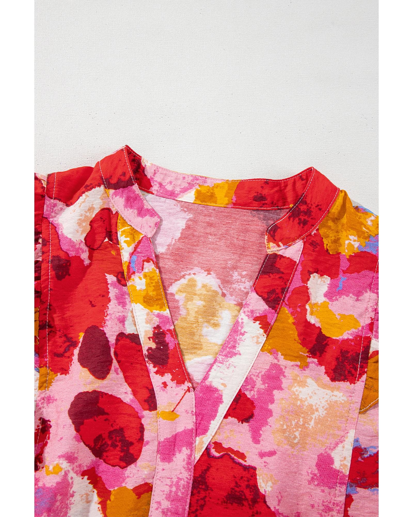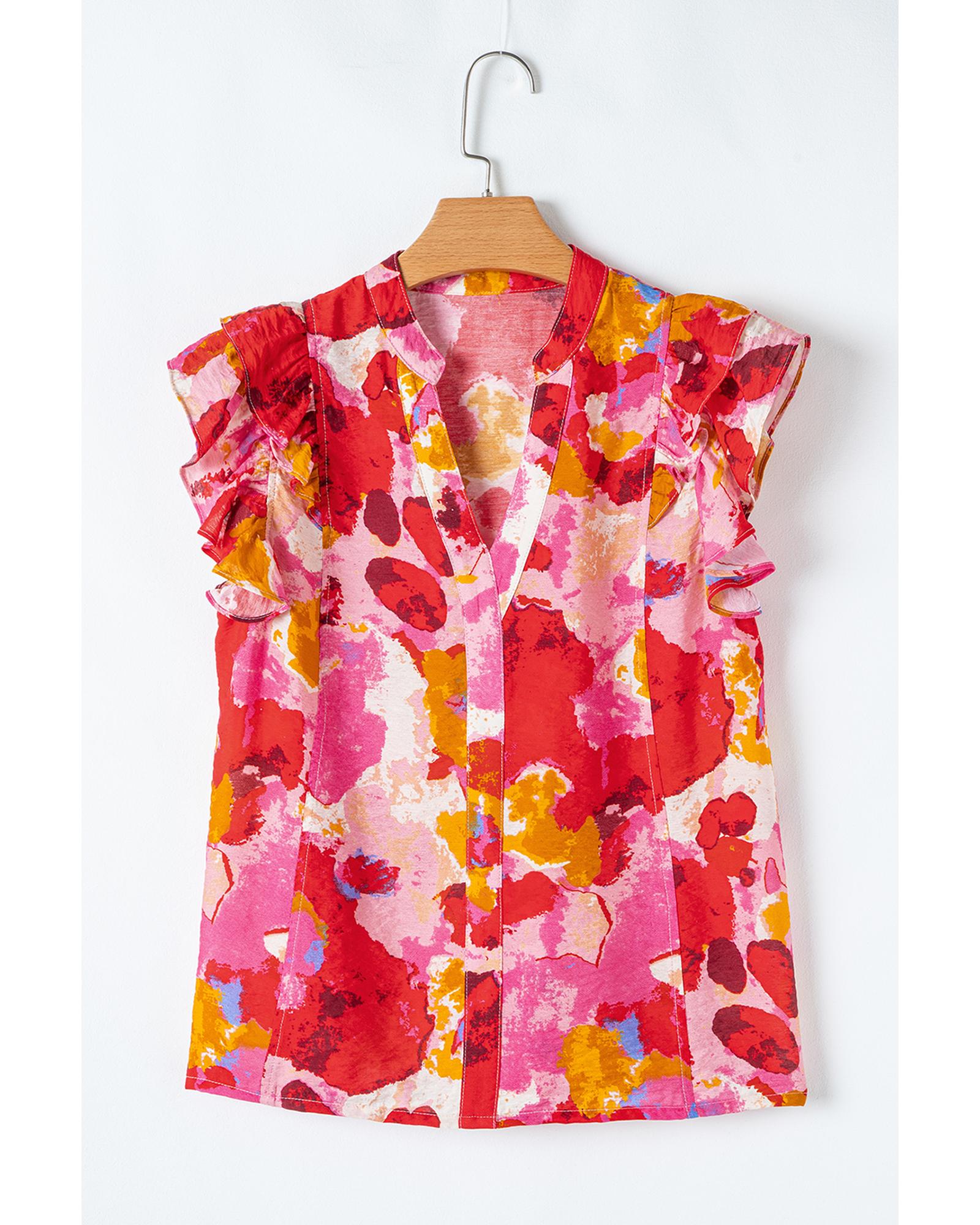 Red Abstract Print Split V Neck Ruffle Short Sleeve Blouse – XL