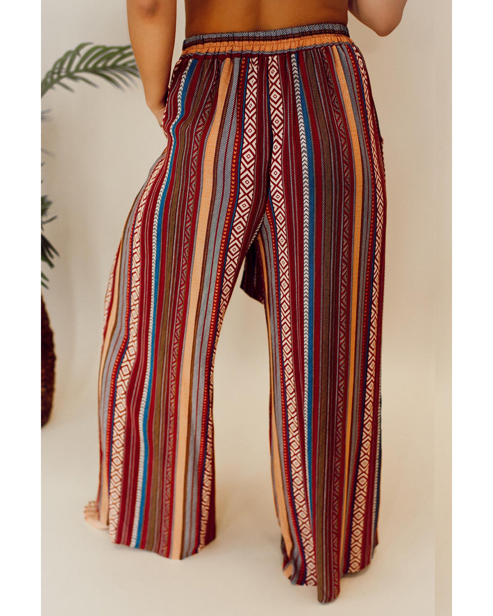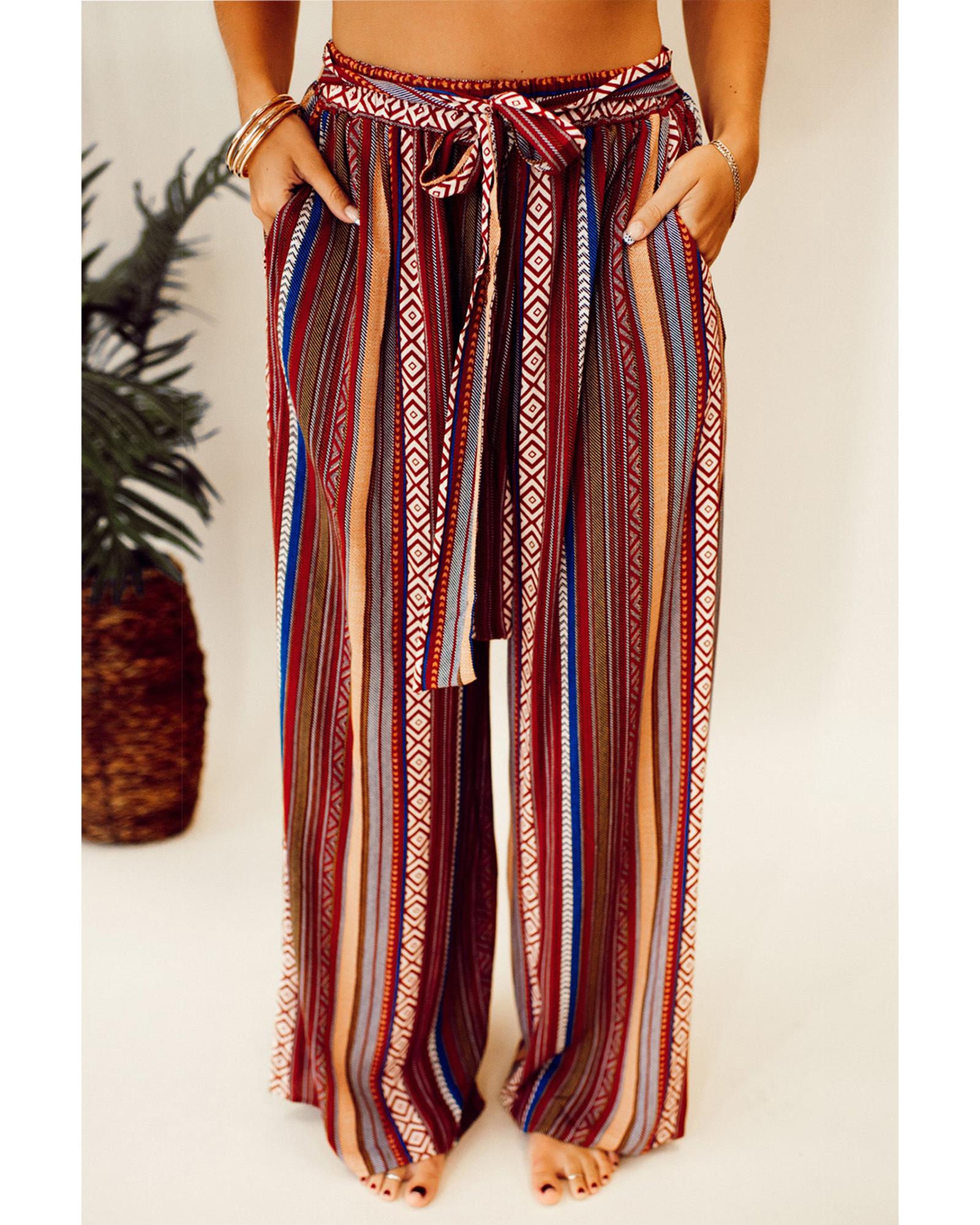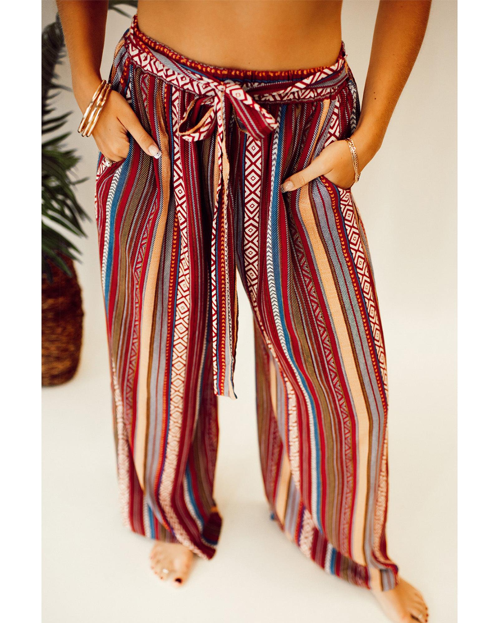 Red Boho Ethnic Striped Print Tie Waist Wide Leg Pants – L